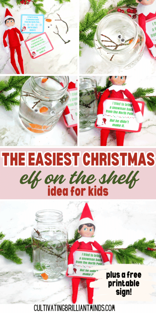 The Elf on the Shelf melted snowman idea is all about laughter, imagination, and a little holiday wonder. It’s proof that even the simplest setups can feel magical. With googly eyes floating in a glass of water, a carrot nose bobbing up and down, and the Elf on the Shelf printable sign which explains just what is going on here, this elf scene is guaranteed to be a hit.