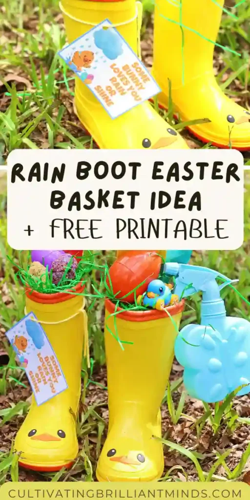 Bright rain boots turn into a creative Easter basket idea for kids filled with toy garden tools, treats, DIY seed bombs, and a free printable Easter tag.