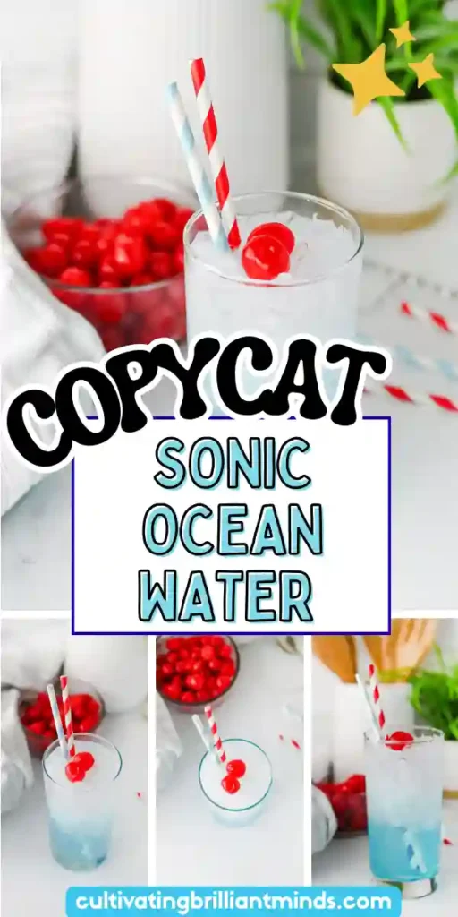 This ocean water is the best copycat recipe of Sonic’s ocean water. It has all that delicious coconut flavor, the classic ocean blue color, and a cherry topping. Plus, the best part is this copycat Sonic ocean water tastes the same but is healthier for you! Sonic’s Ocean Water has approximately 100 grams of sugar in a large, so it’s definitely not a drink you or your kids want to be drinking often. But, with this version, you can make it more often without all that sugar!
