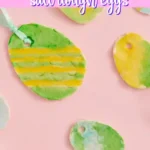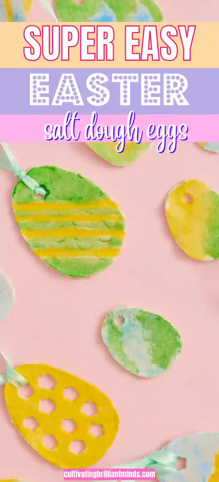 easter eggs made out of salt dough, painted with food coloring with a ribbon attached to the top to hang