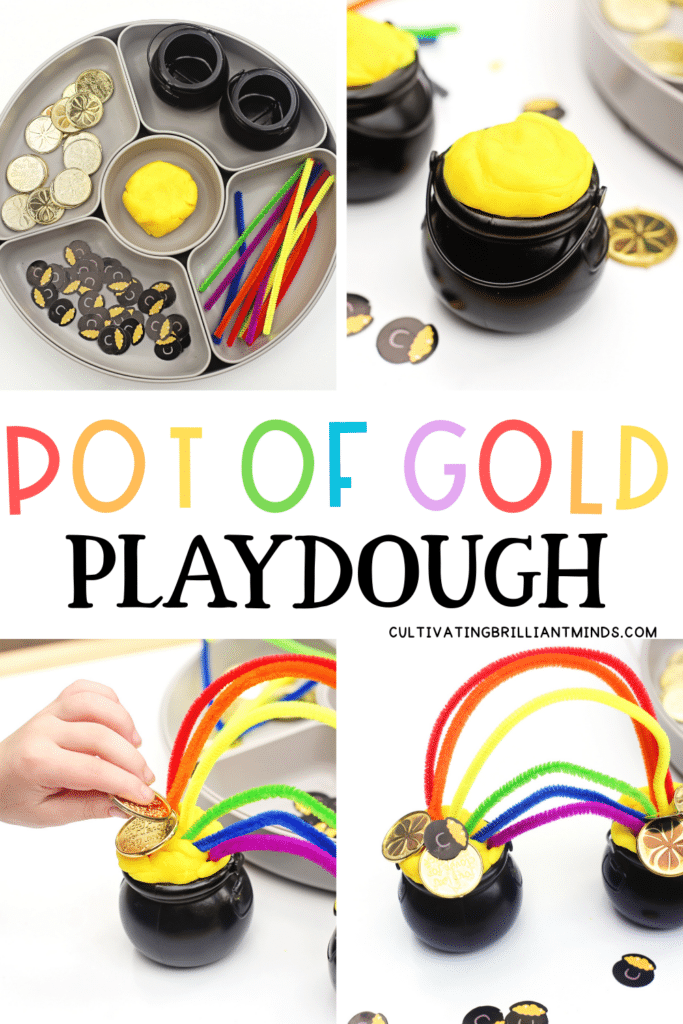 This pot of gold playdough tray supports multiple developmental areas through hands-on exploration.
