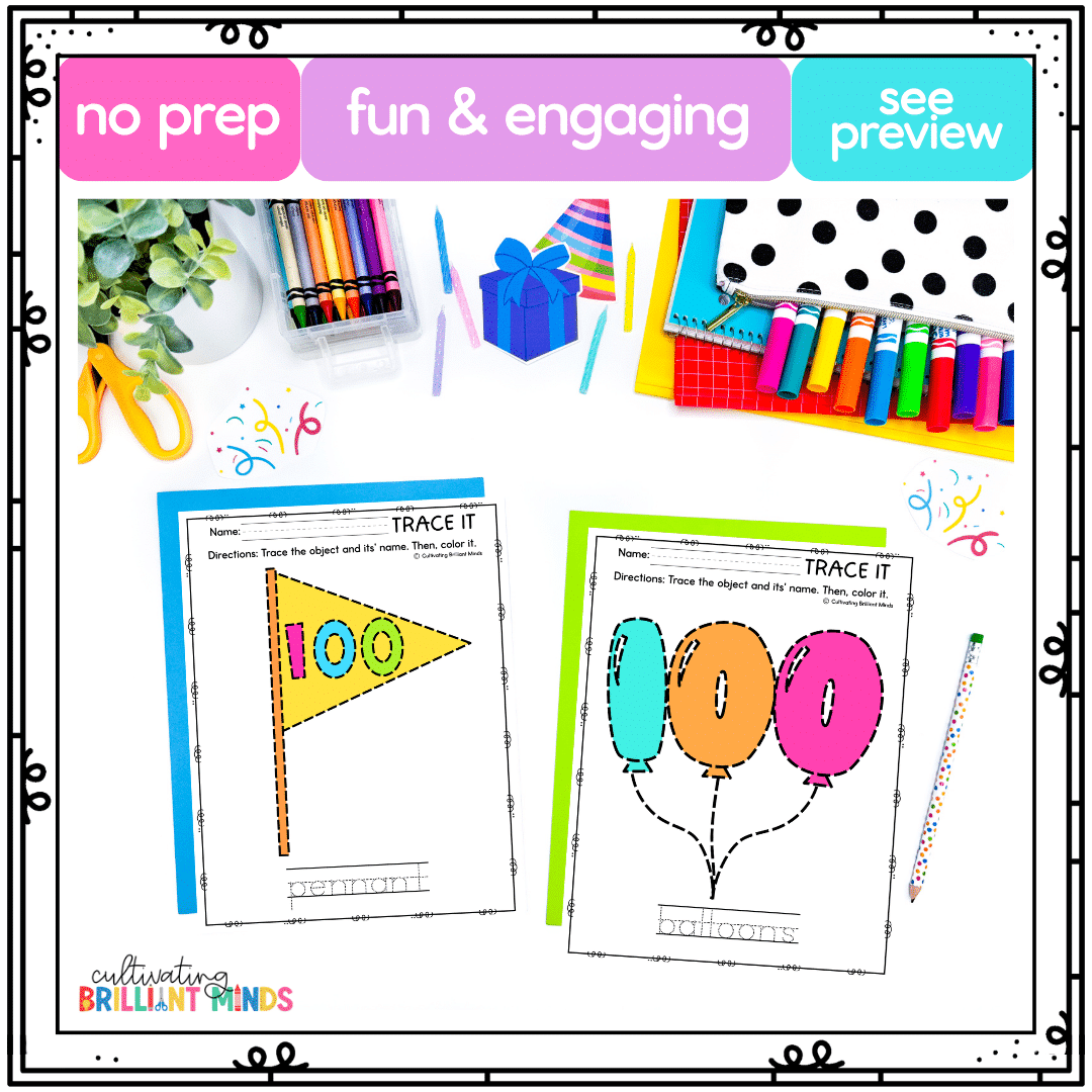Get your students building motor skills like pros this 100th day with these fun 100th day of school-themed fine motor tracing activities! Your students will love making these 100th day-themed items by tracing the lines with these hands-on and engaging cards that will help build the muscles in their hands and fingers. Use these fun motor activities for morning work, morning tubs, centers, or sub plans!