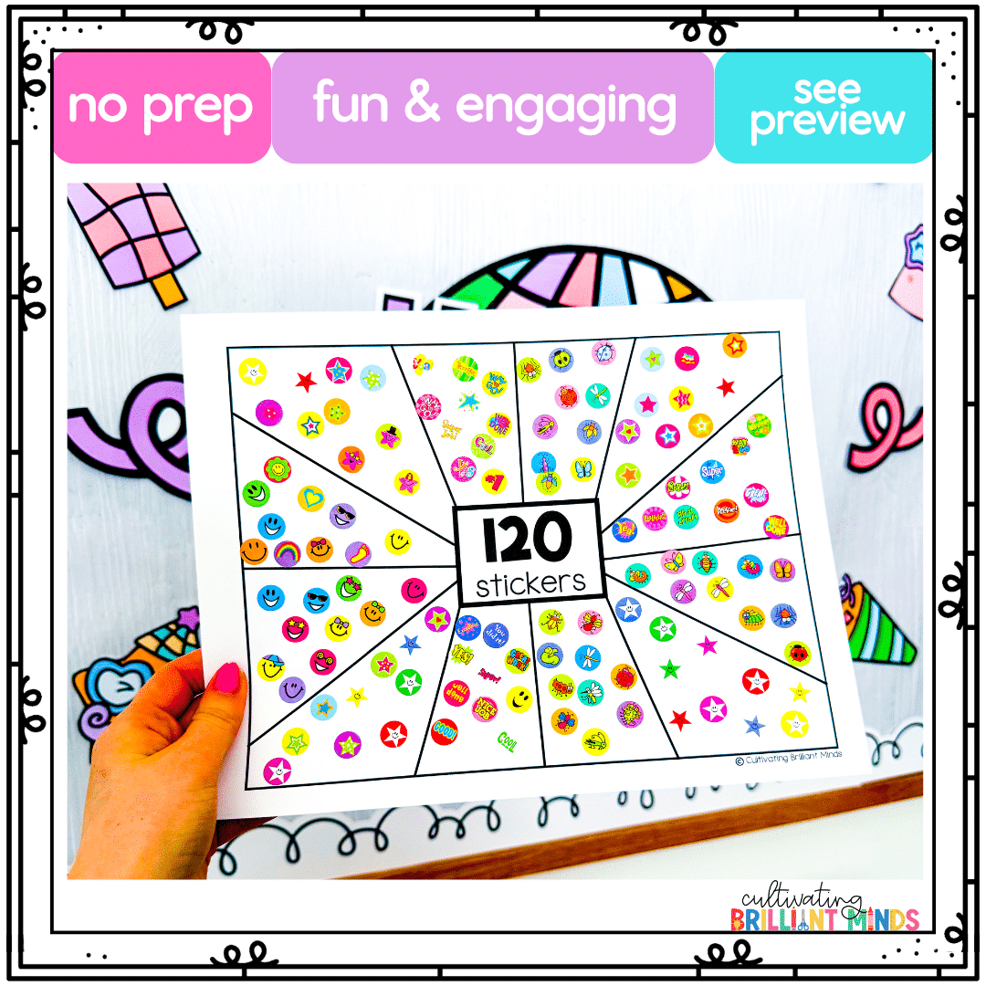 Celebrate the 120th day of school in your classroom with these no-prep sticker sheets! Invite the magic of the 120th day of school into your classroom and encourage students to have some fun! These sticker sheets are perfect for morning work, morning tubs, math centers, 120th day centers, recess, early finishers, + more! These make a great bulletin board display when finished because each one is unique!