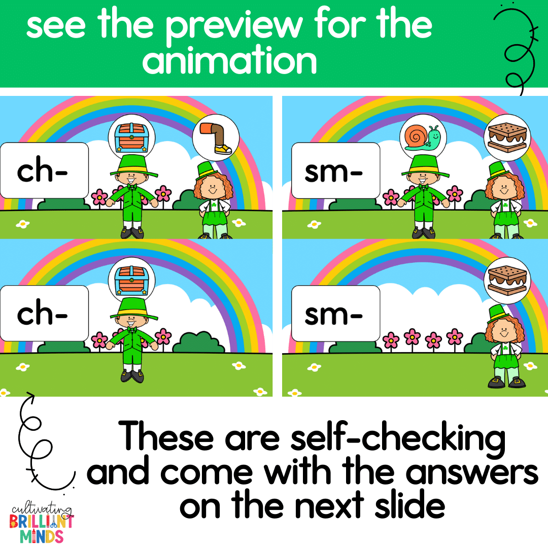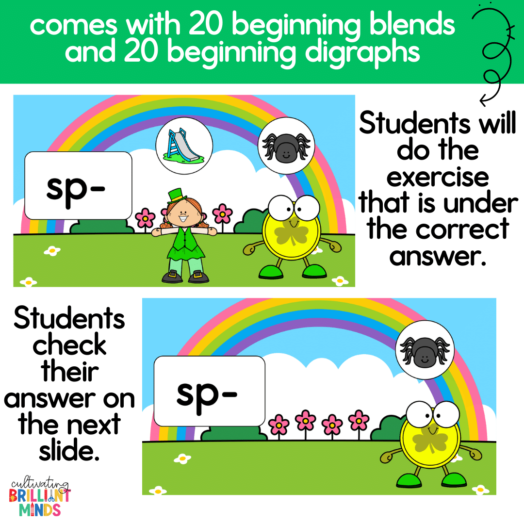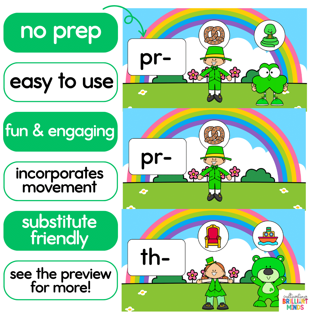 These animated St. Patrick’s Day exercise slides are the perfect way to incorporate movement while practicing beginning blends and beginning digraphs! These St. Patrick’s Day activities are great for morning meeting, brain breaks, whole group literacy and phonics lessons, indoor recess, and holiday parties! Check out the video preview for the animation.