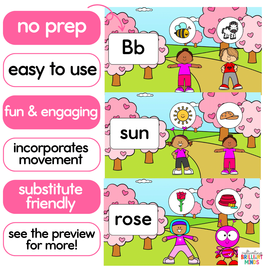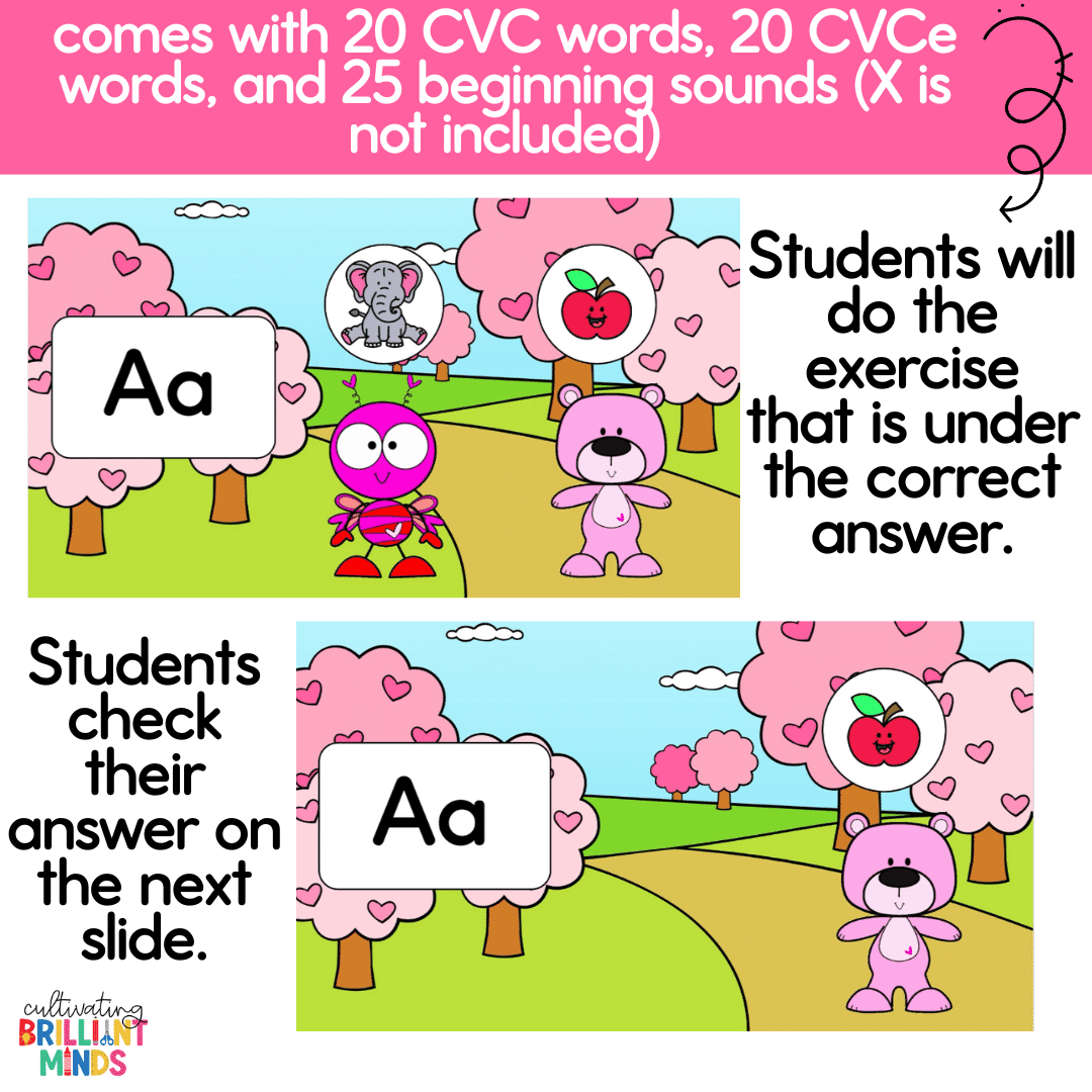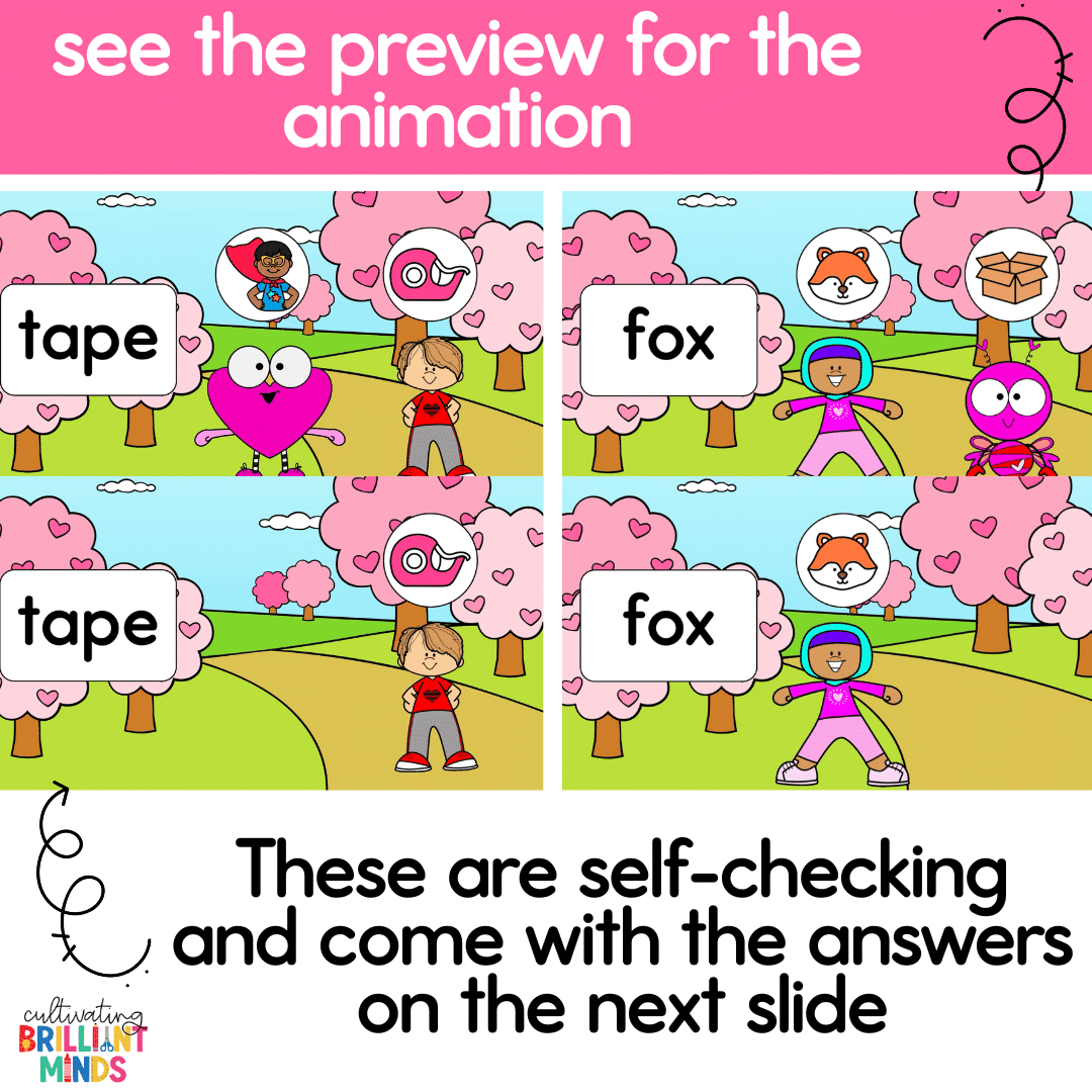 These animated Valentine’s Day exercise slides are the perfect way to incorporate movement while practicing CVC words, CVCe words, and beginning sounds! These Valentine’s Day activities are great for morning meeting, brain breaks, whole group literacy and phonics lessons, indoor recess, and holiday parties!