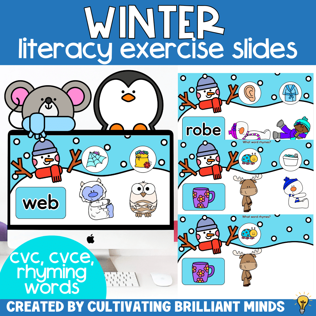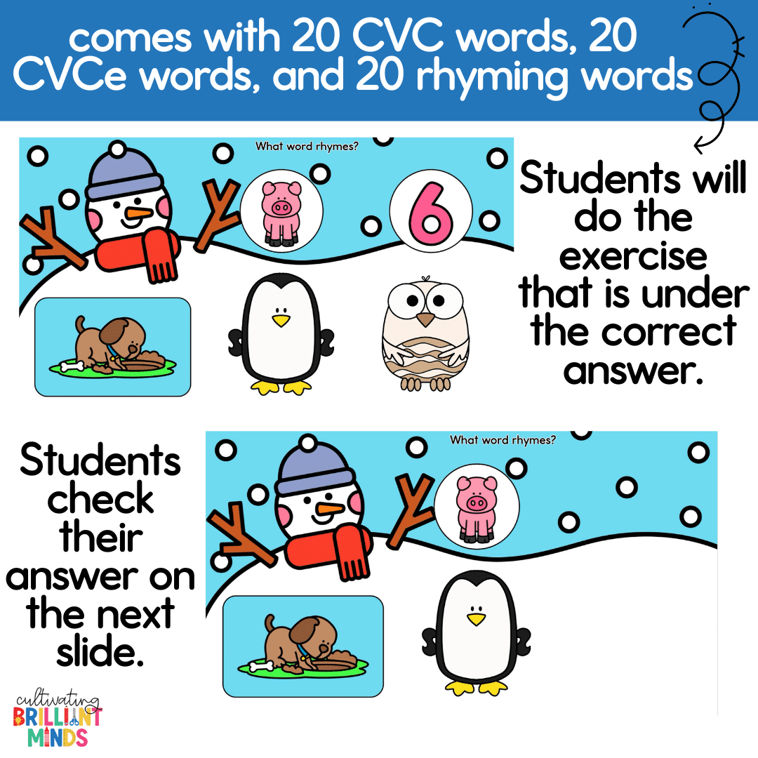 These animated Winter exercise slides are the perfect way to incorporate movement while practicing CVC words, CVCe words, and rhyming words! These winter activities are great for morning meeting, brain breaks, whole group literacy and phonics lessons, indoor recess, and holiday parties! Check out the video preview for the animation.