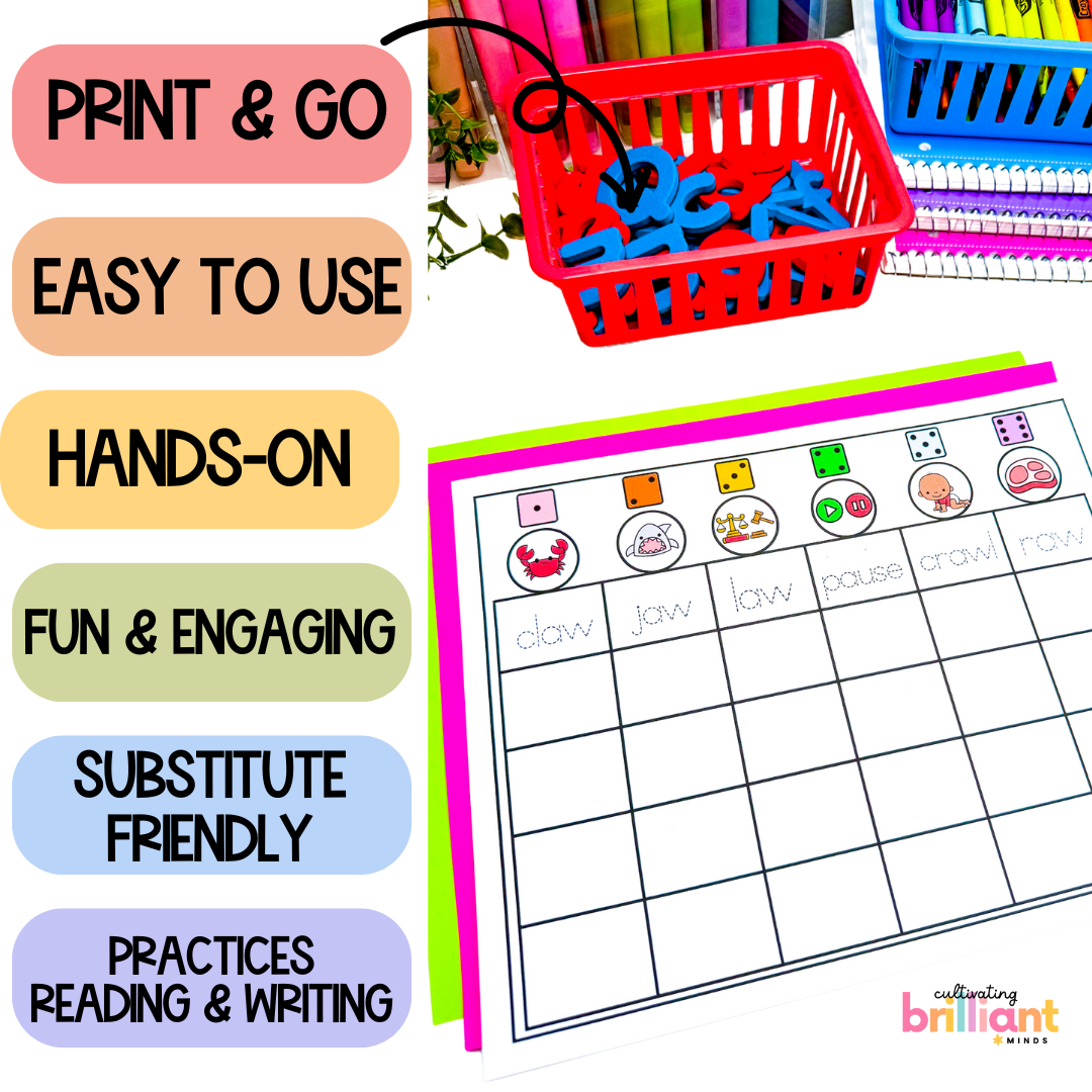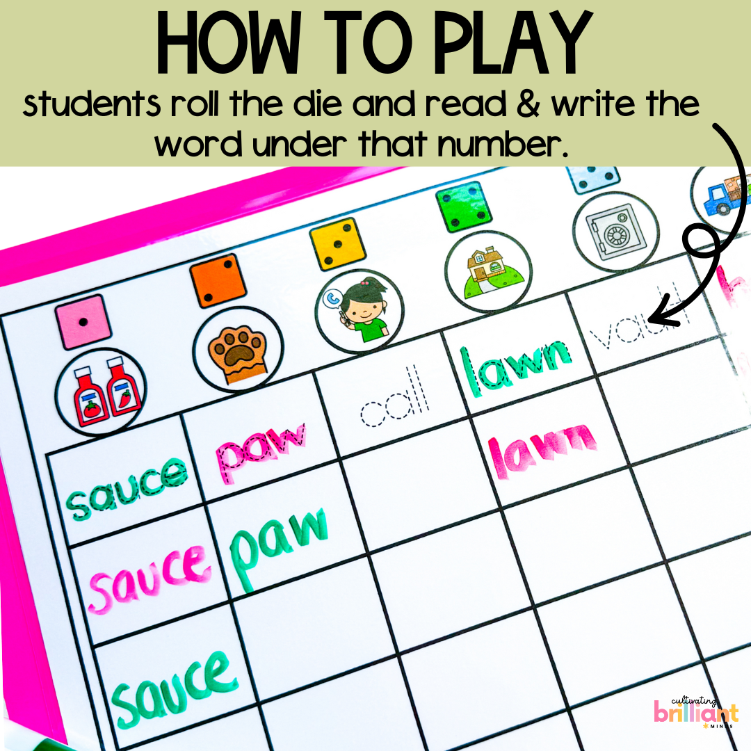 Get your students reading and writing words with the variant vowel /ô/ pattern (au, augh, al, aw) with these Phonics Read and Write Board Games! Featuring decodable variant vowels, these games are just what you need to practice reading and writing with this phonics pattern.