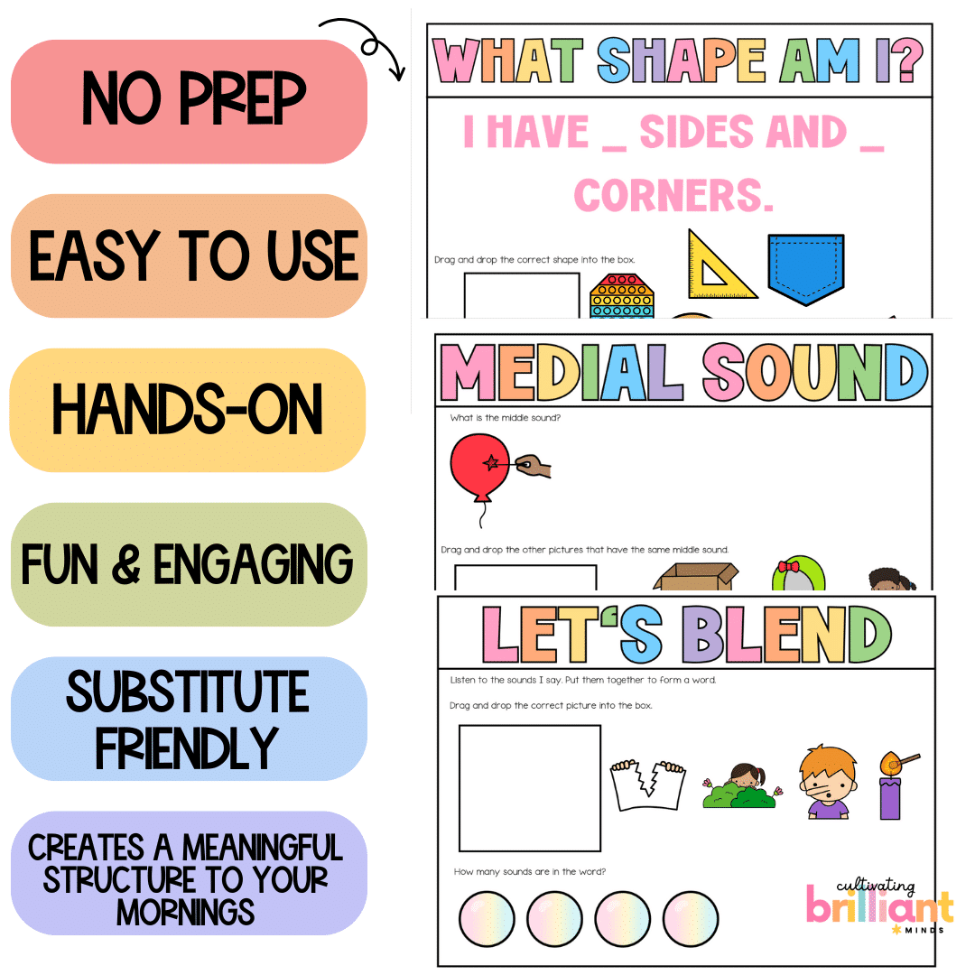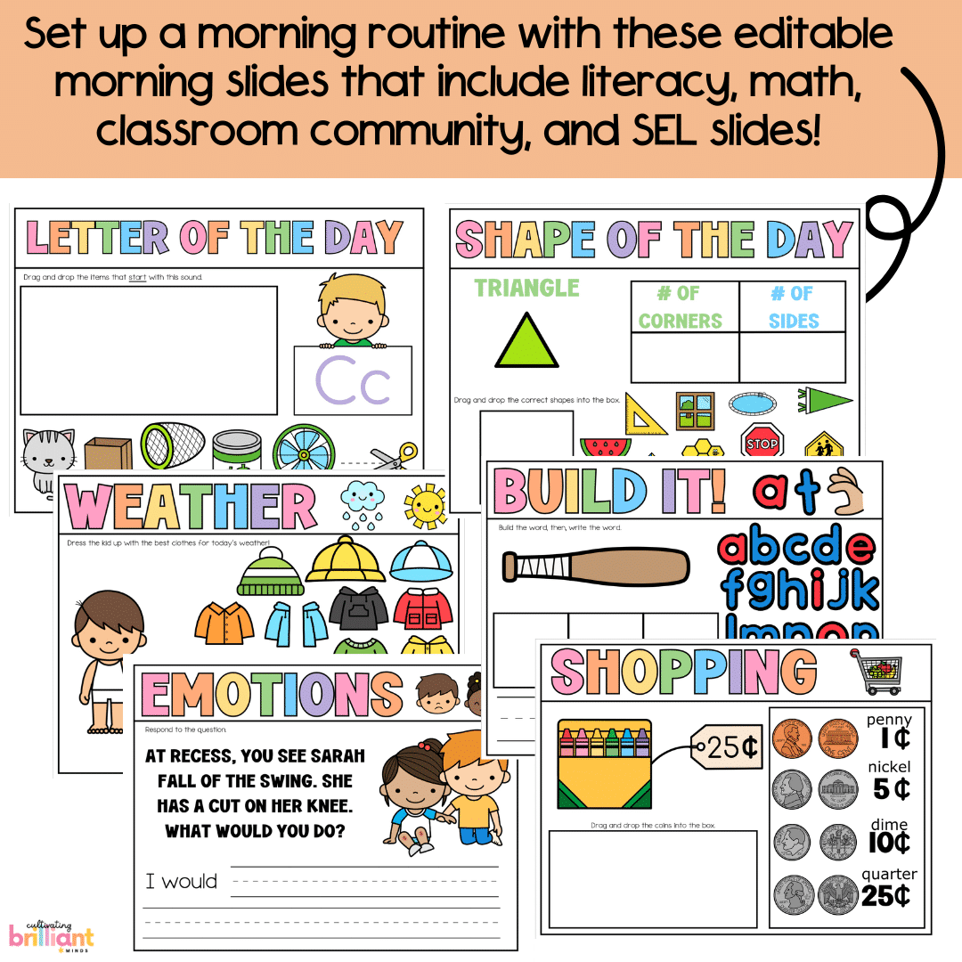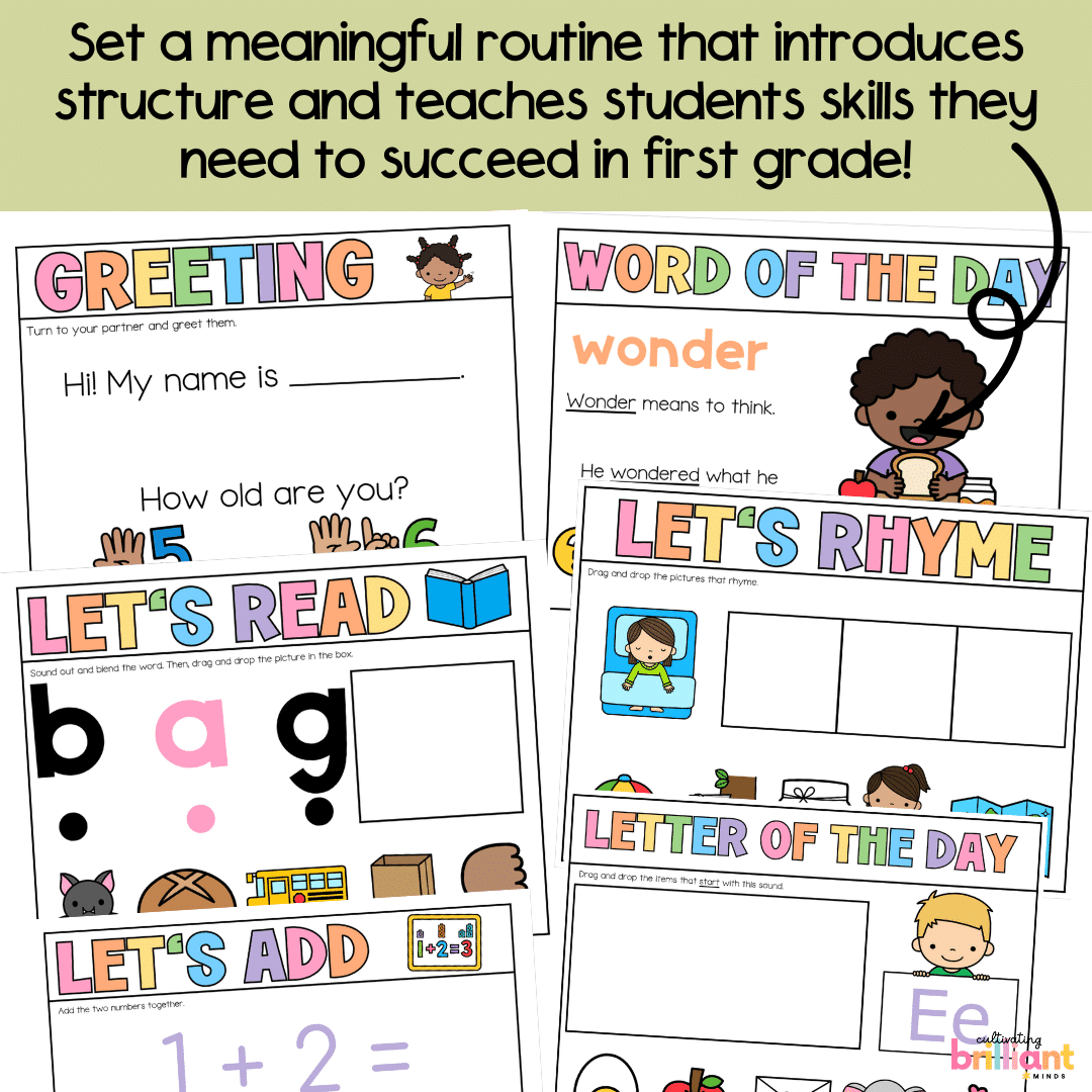 Let’s get your first grade classroom started off on the right foot this year with these hands-on and engaging done-for-you back to school August Morning Meeting Slides. Create a consistent and meaningful structured morning routine with these digital slides that include essential first grade math, literacy, and social emotional learning (SEL) activities.