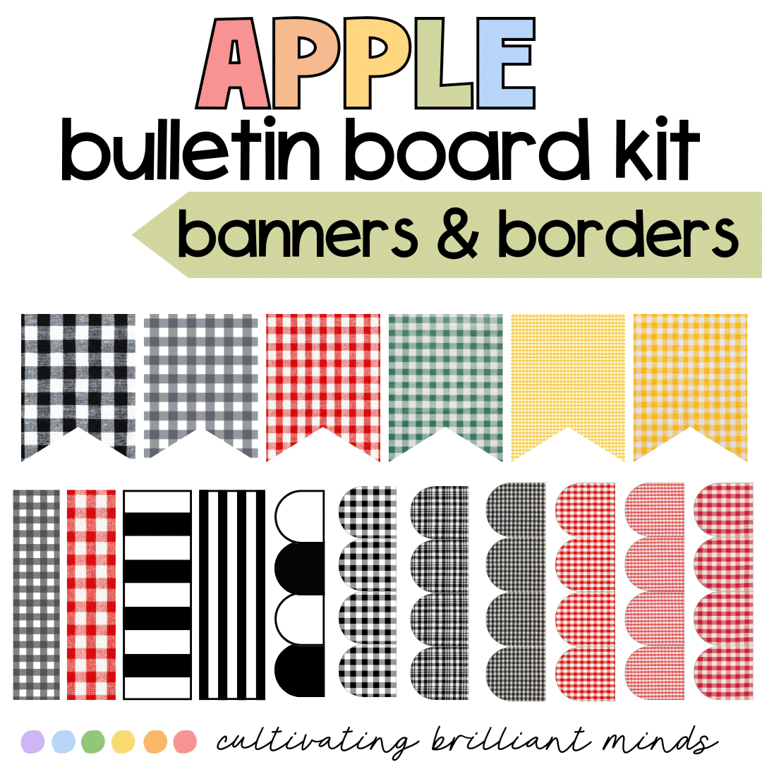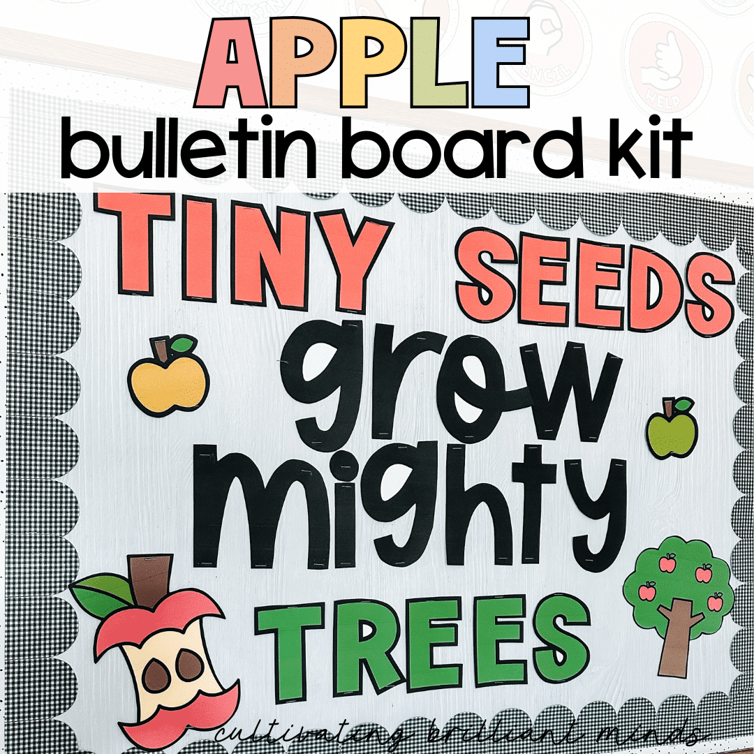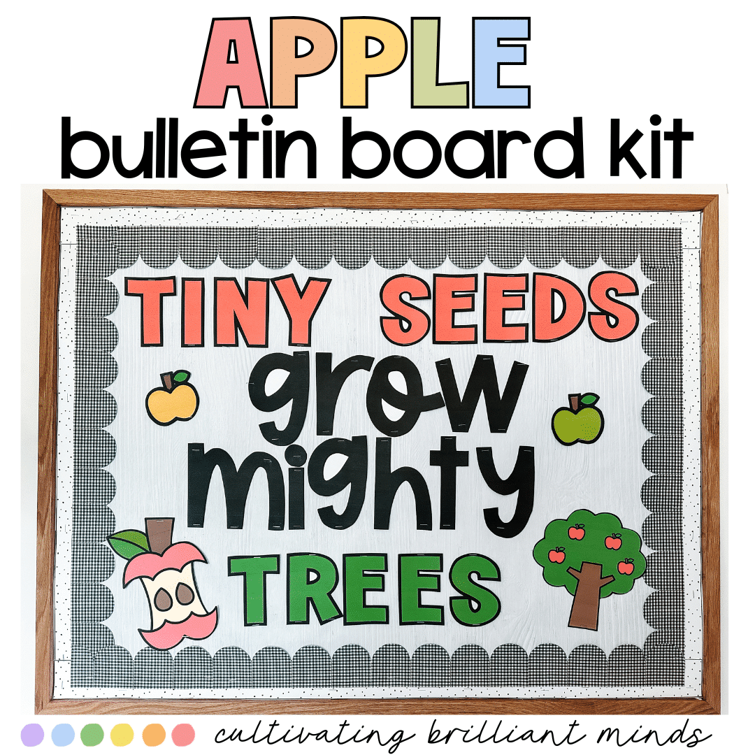 This back-to-school apple bulletin board kit is perfect for a fall-themed bulletin board or door decor! Use it for back-to-school season or in August & September when teaching about Johnny Appleseed.