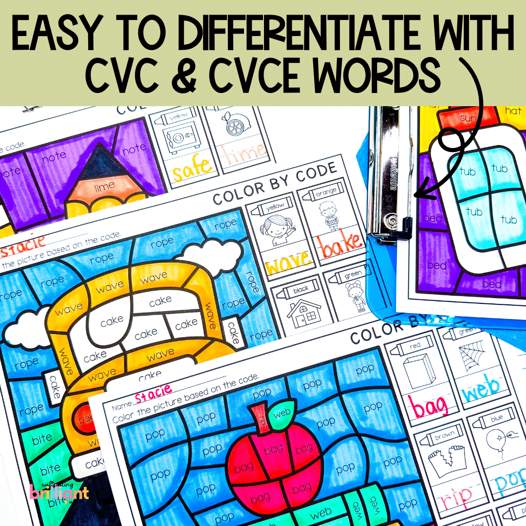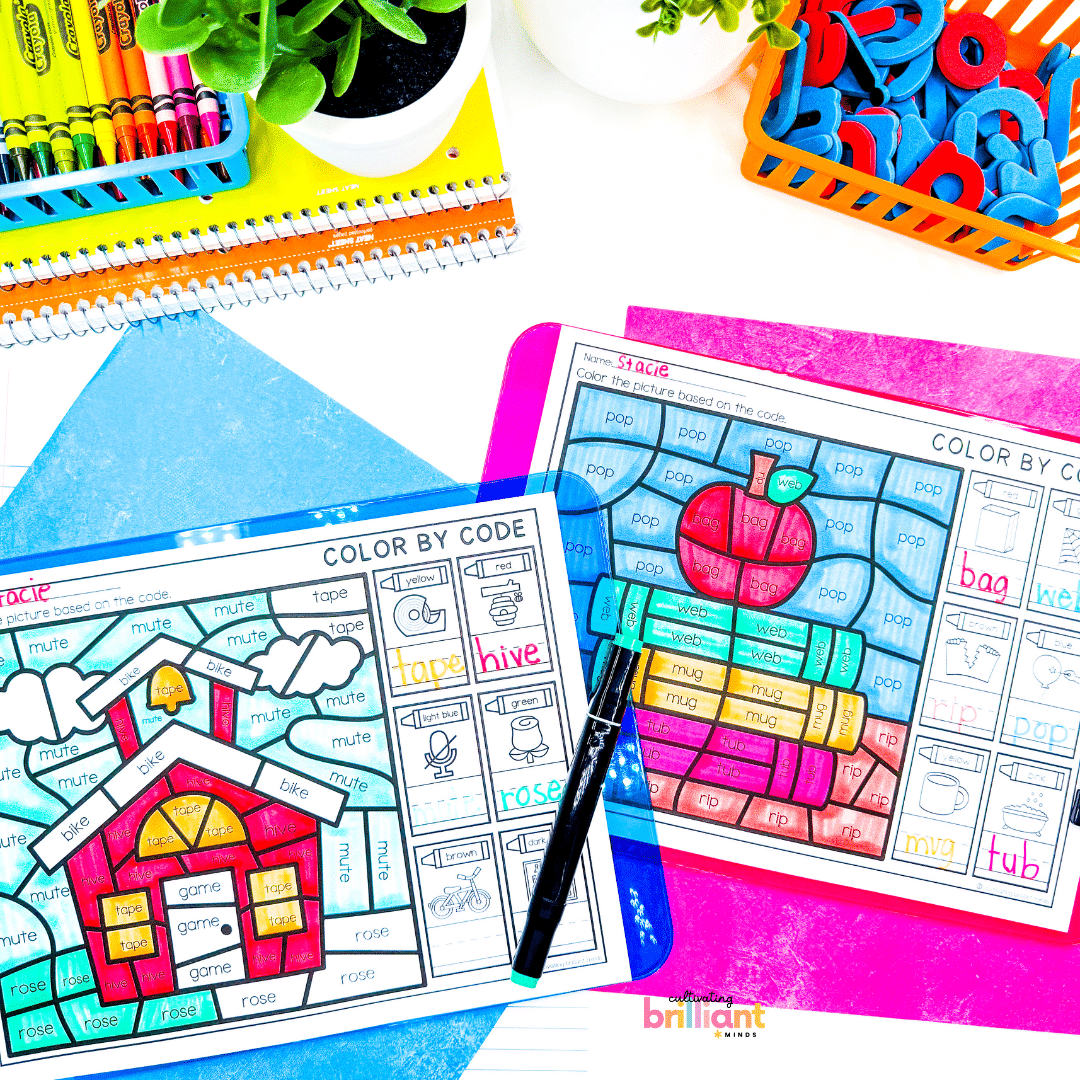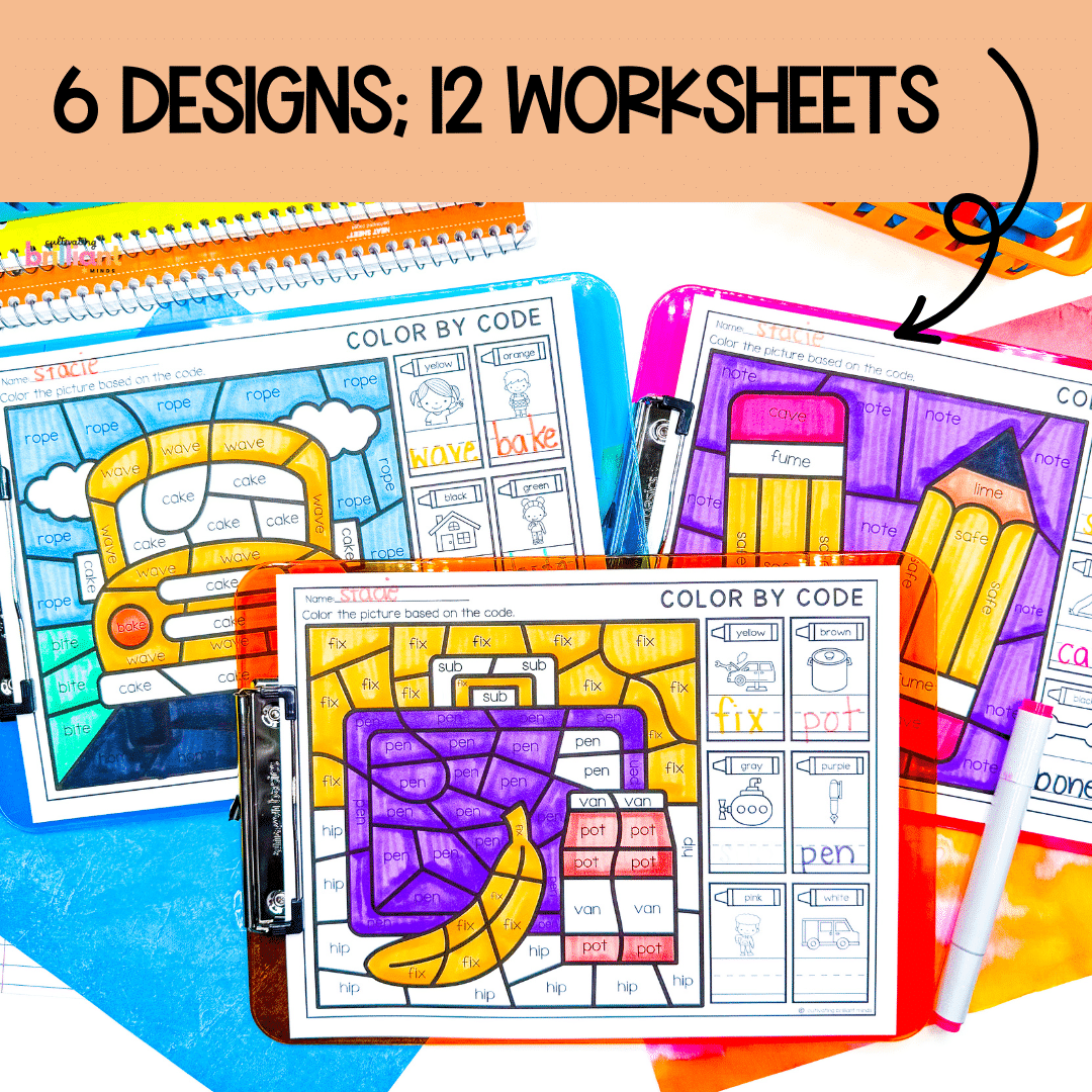 - 6 CVC and CVCe Word school-themed color by codes (12 color by codes total)