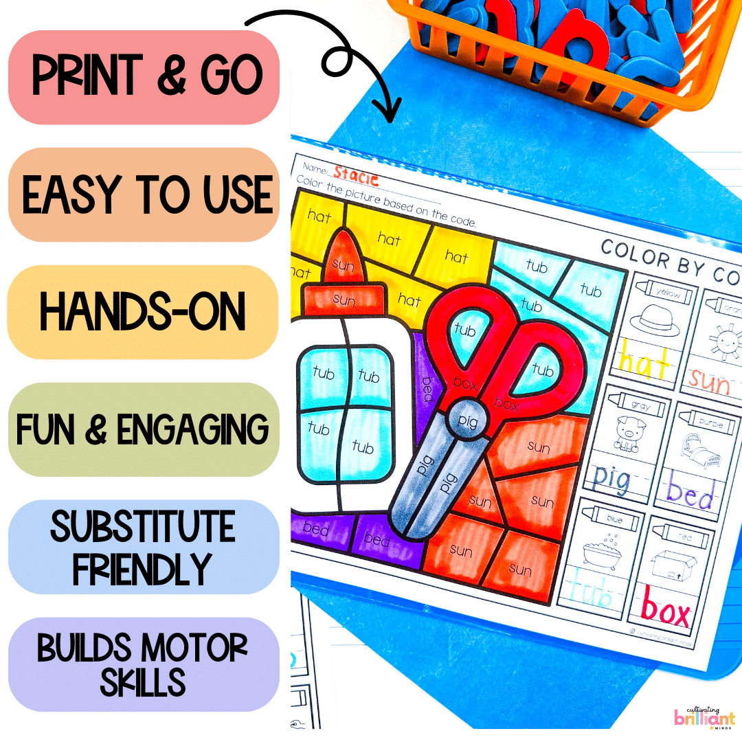 Get your students reading and writing CVC words with these fun and engaging beginning of the year school color by codes! Featuring decodable CVC and CVCe words, these fun phonics activities are just what you need to practice reading and writing CVC words this back to school season.