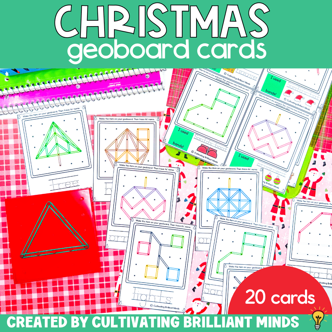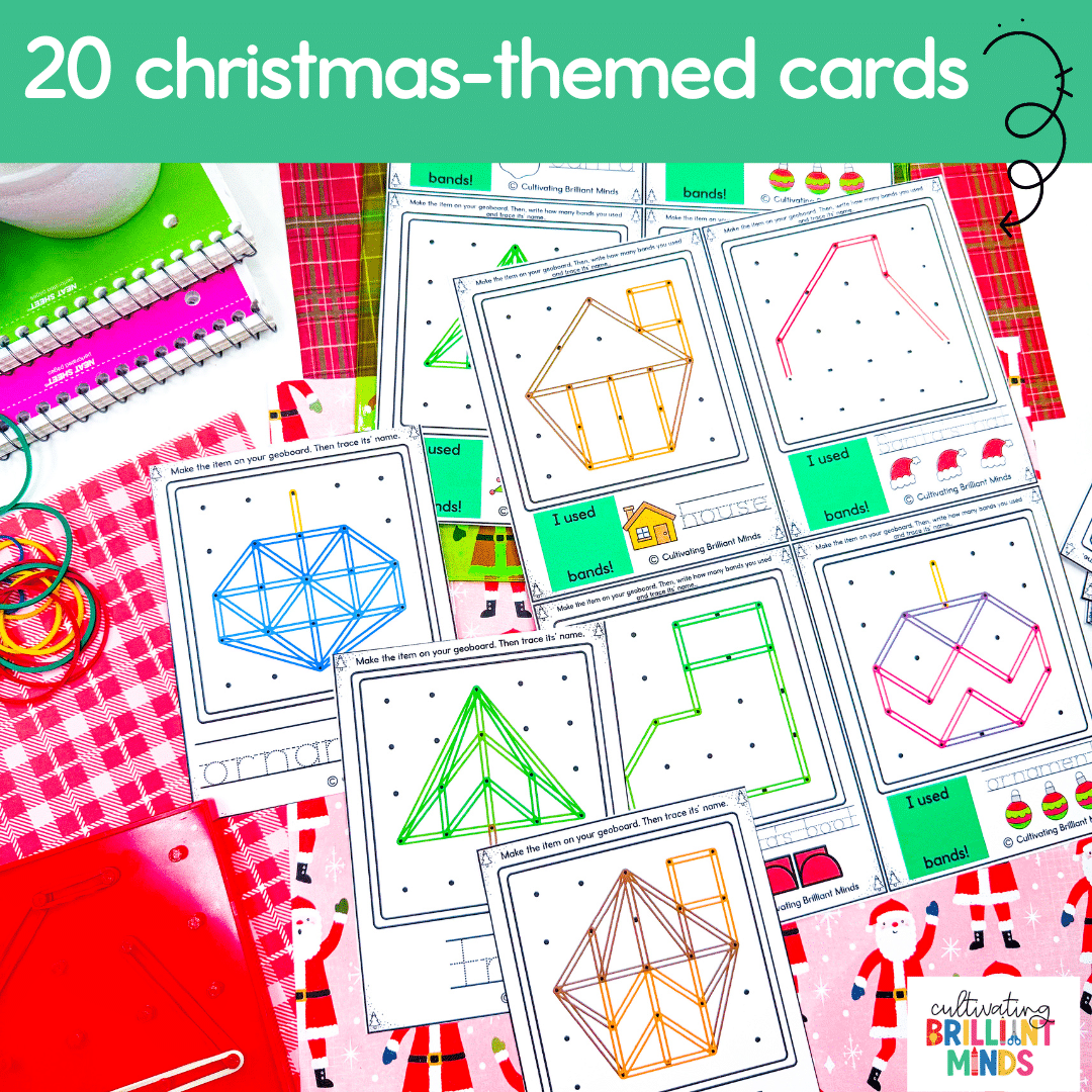 - 20 Christmas-themed geoboard cards (10 designs, 2 levels of difficulty)