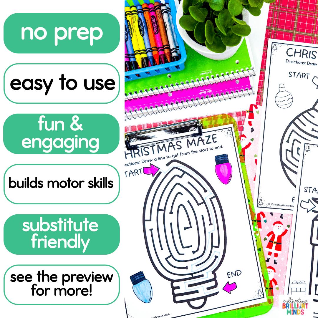 Get your students building motor skills like pros this December with these fun Christmas-themed fine motor skill mazes! Your students will love going through these mazes with these hands-on and engaging worksheets that will help build the muscles in their hands and fingers. Use these fun motor activities for morning work, morning tubs, centers, or sub plans!