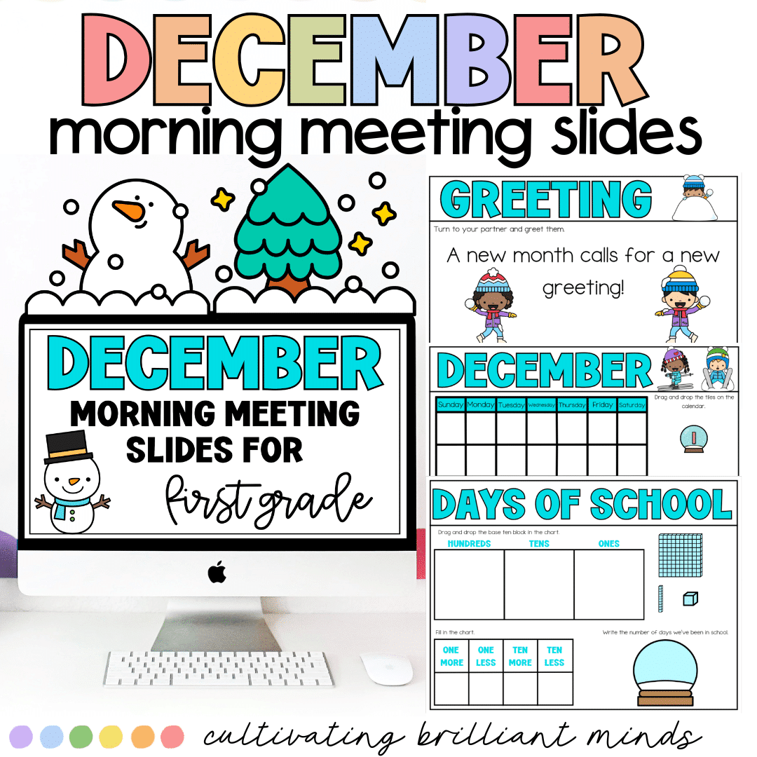 Let’s get your first grade classroom started off on the right foot this year with these hands-on and engaging done-for-you December Morning Meeting Slides. Create a consistent and meaningful structured morning routine with these digital slides that include essential first grade math, literacy, and social emotional learning (SEL) activities.