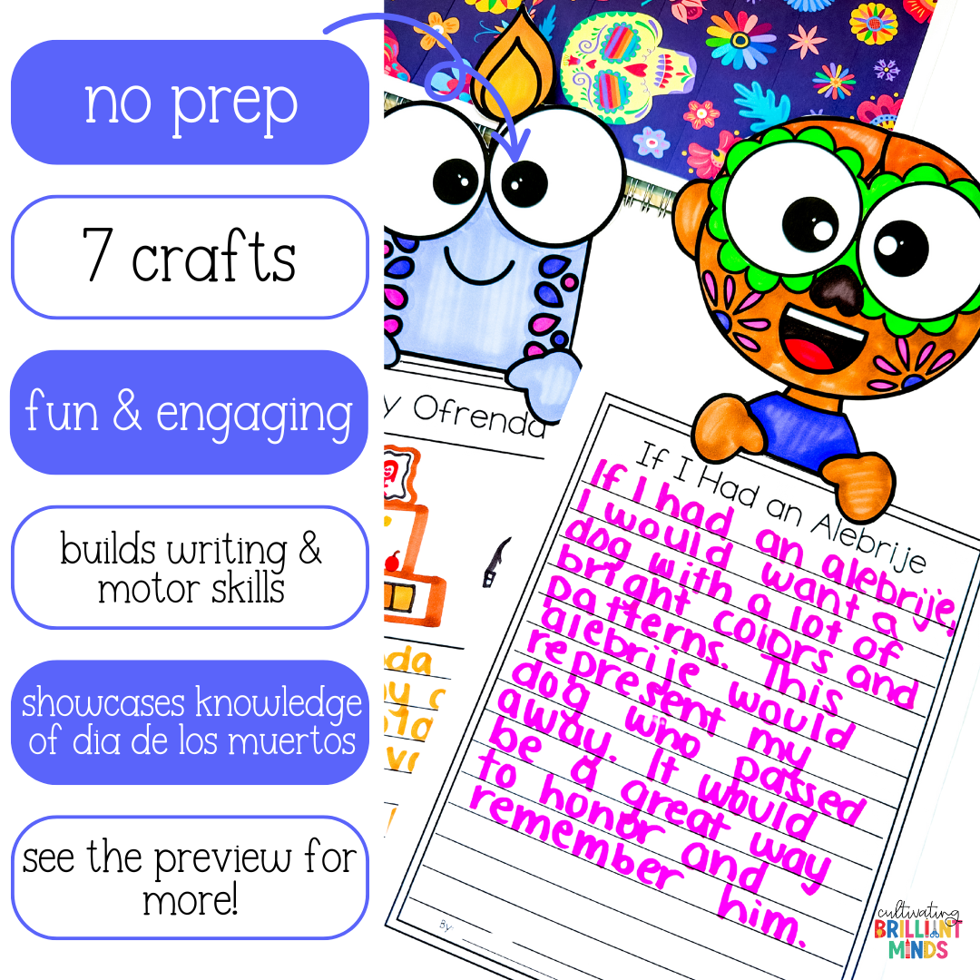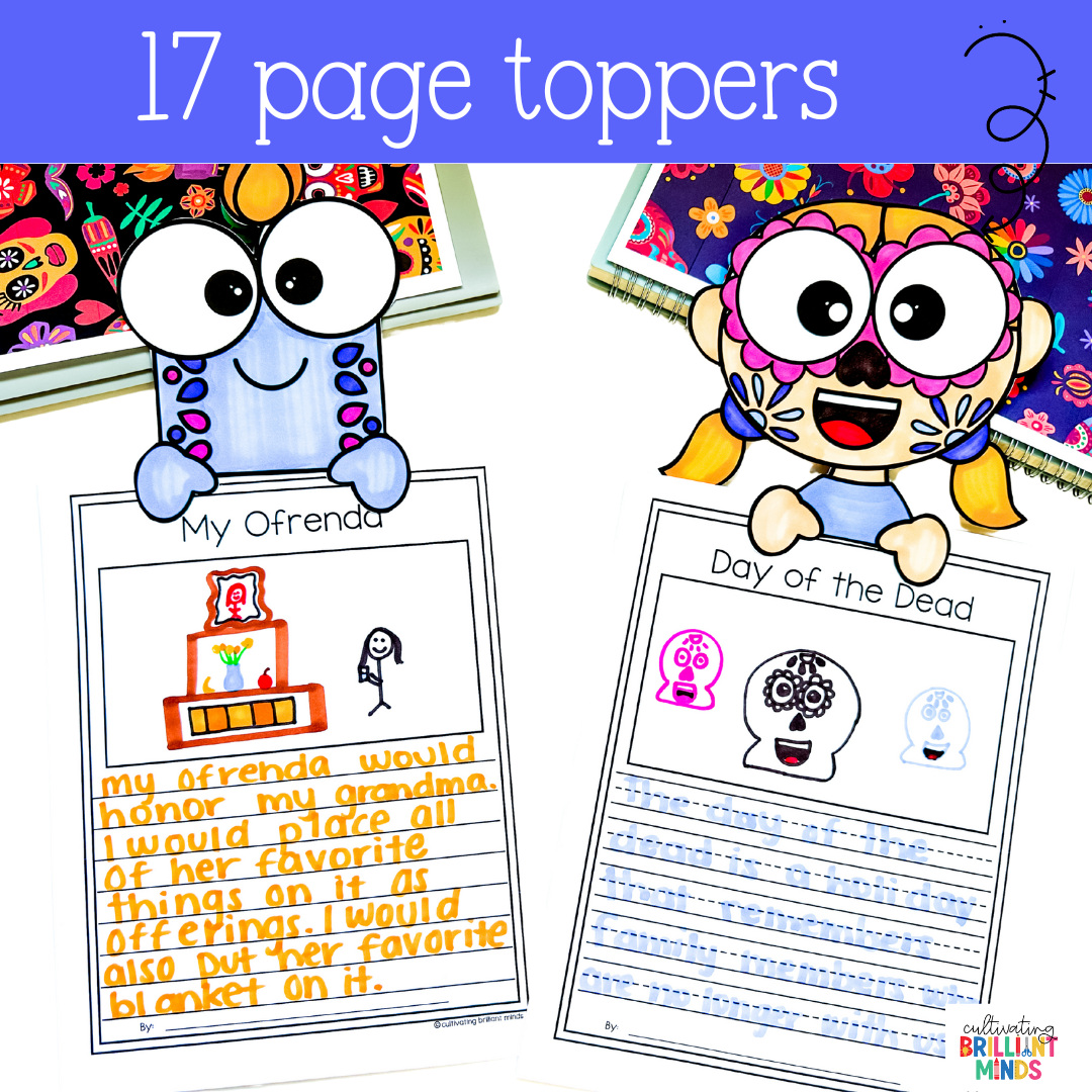Get your students writing like pros and showcasing their knowledge with these Day of the Dead writing crafts! These Dia de los Muertos crafts include various writing prompts and page toppers for students to choose from. These no prep writing crafts make a festive bulletin board display as well!