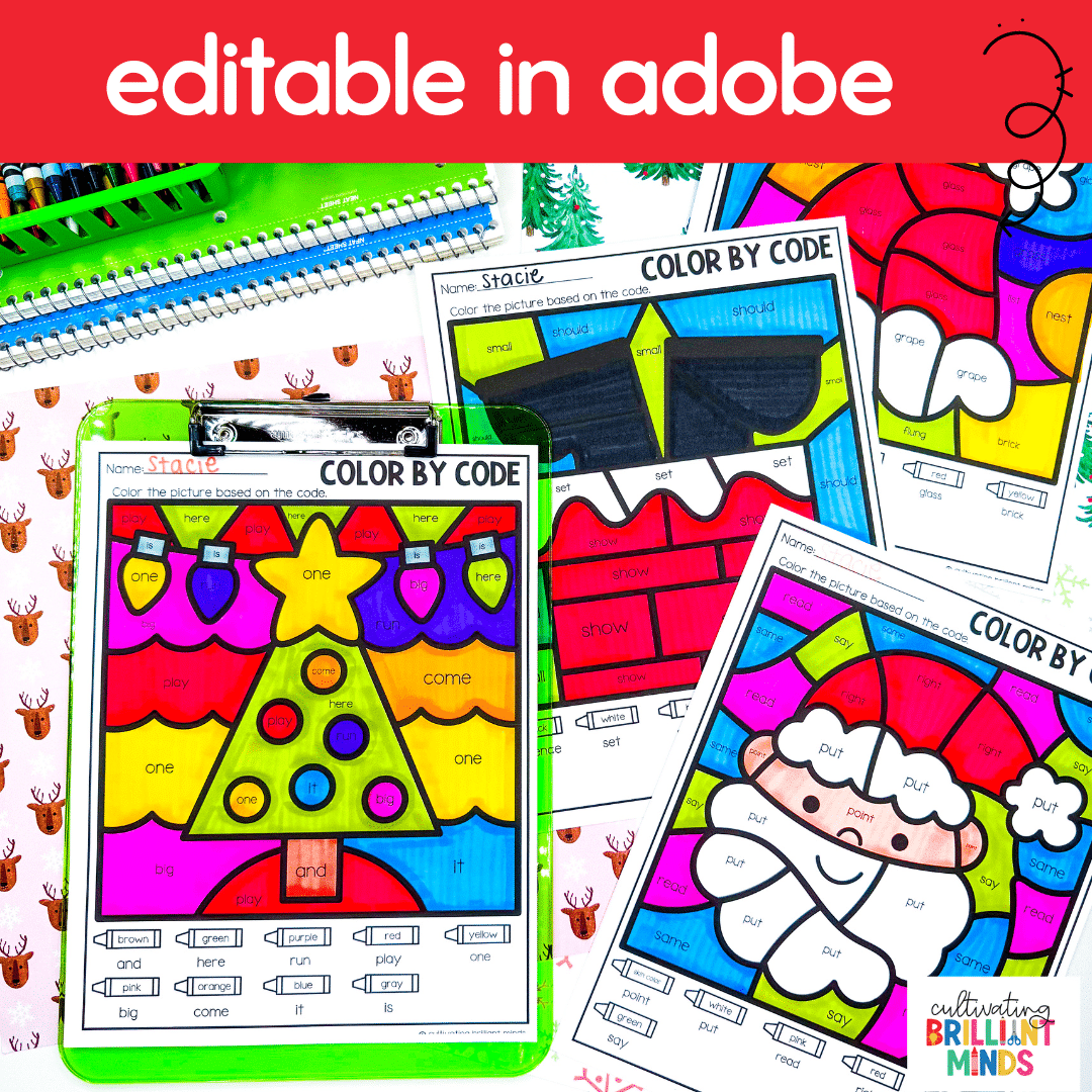 Are you looking for a fun way to practice sight words this Christmas? My EDITABLE Christmas Color by Codes are the perfect way to practice sight words. Use it for morning work, centers, intervention, or homework! This pack includes 20 editable color by codes and 8 pre-filled packs! Differentiation is easy when you can add in your own words in Adobe! Simply type in your words and the color by code will autofill! These color by code pages are fun and engaging for preschool, kindergarten, first grade, and second grade!