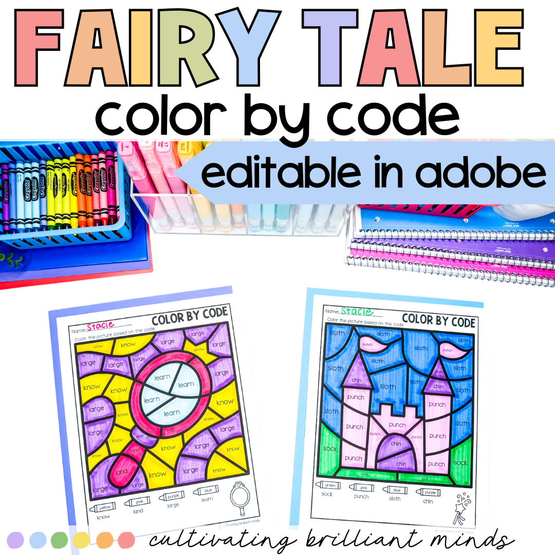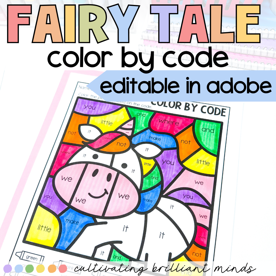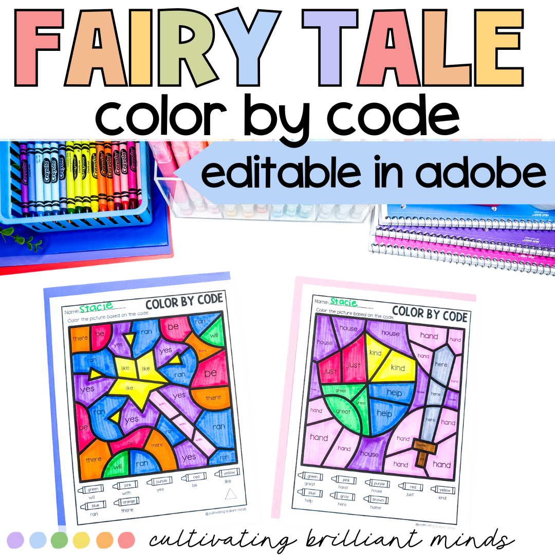 Are you looking for a fun way to practice sight words? My EDITABLE Fairy Tale Color by Codes are the perfect way to practice sight words. Use it for morning work, centers, intervention, or homework! This pack includes 12 editable color by codes and 8 pre-filled packs! Differentiation is easy when you can add in your own words in Adobe! Simply type in your words and the color by code will autofill! These color by code pages are fun and engaging for preschool, kindergarten, first grade, and second grade!