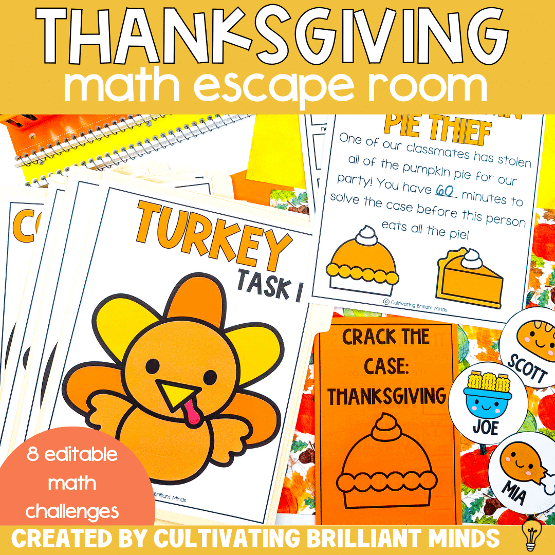 Get your students practicing essential math skills like pros with this fun Editable Thanksgiving Math Mystery Escape Room Game. Featuring editable 8 math tasks, your students will have a blast completing challenges to find out which of their classmates is the pumpkin pie thief!