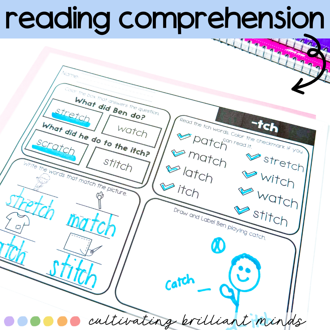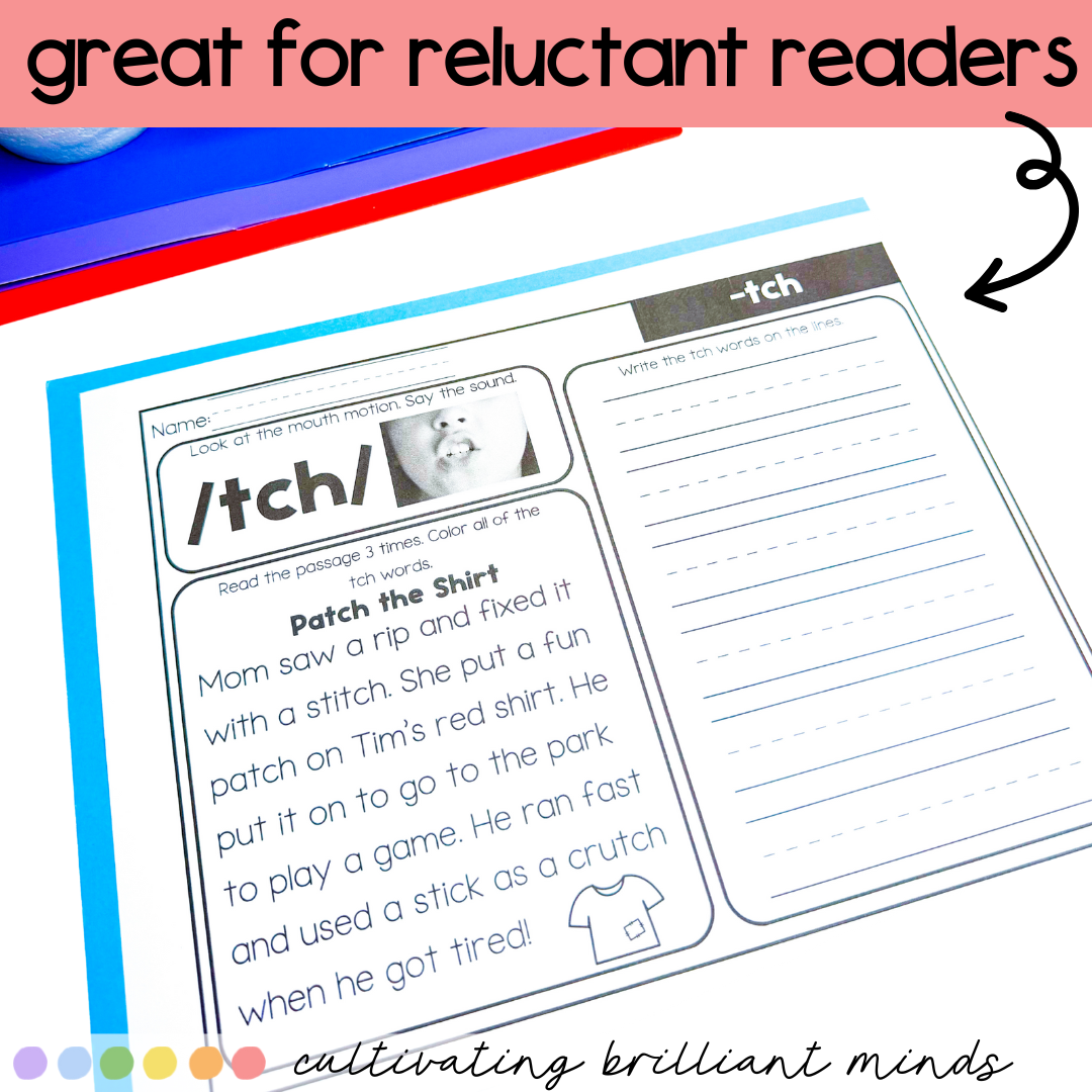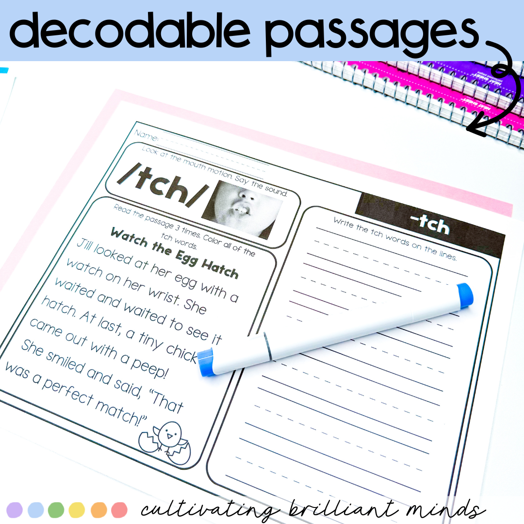 Are you looking for decodable passages with comprehension questions and word work for TRIGRAPH -TCH words? These -tch Decodable Passages are perfect for First Grade and Second Grade. Utilizing decodable words and common sight words, these decodable passages allow students to focus on the sound. These include a real-life picture of the mouth movement to say the sound.
