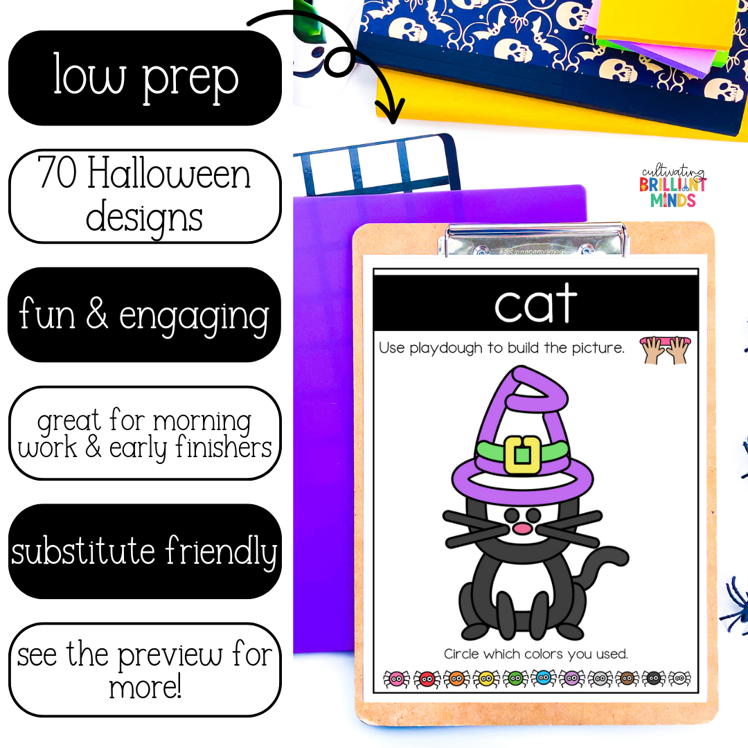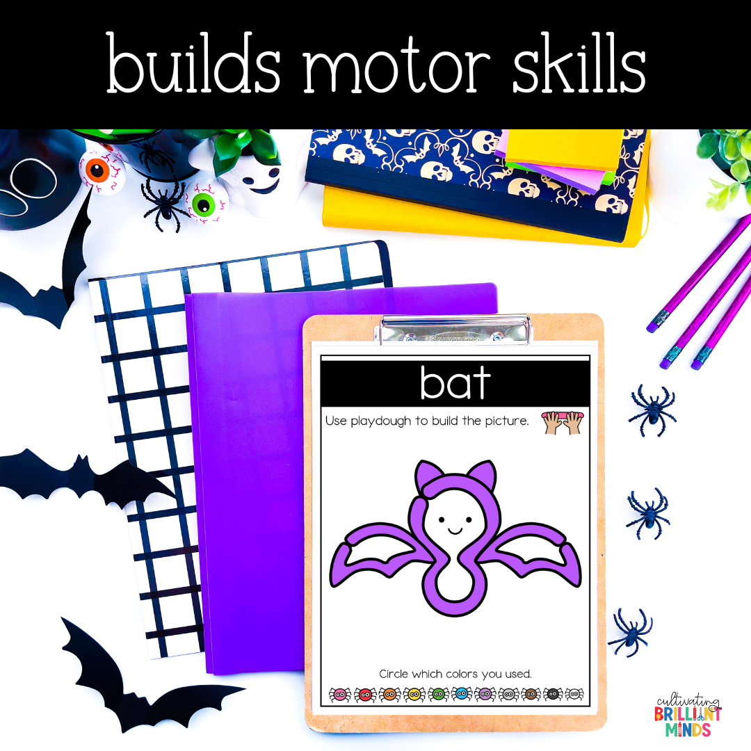 Get your students building their fine motor skills with these fun hands-on Halloween Playdough Mats! This low-prep center is easy to implement and focuses on color recognition and writing. These play dough activities are perfect for targeting motor skills & make great centers or morning tubs. These are great to pair with your Halloween activities!
