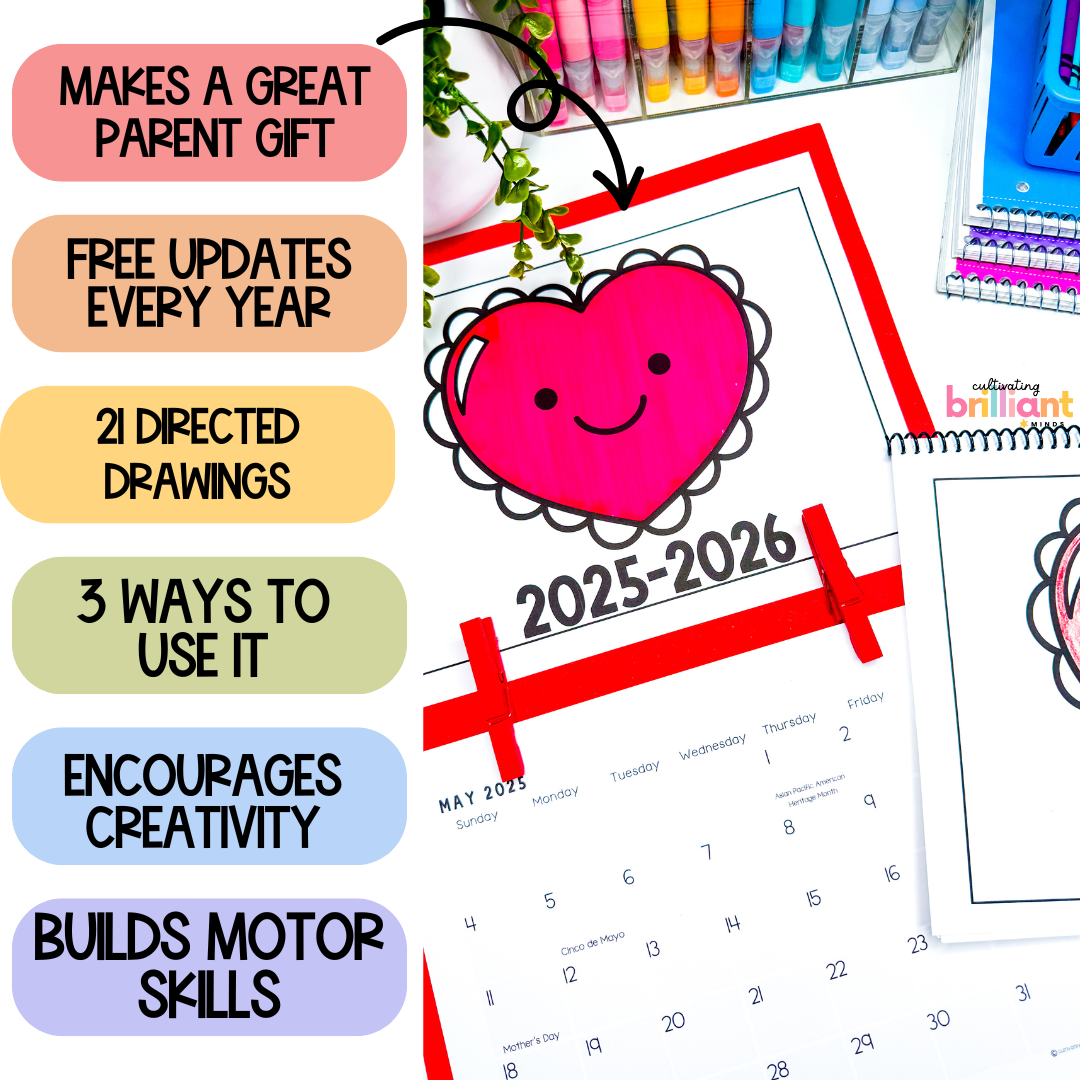 Get your students creating the best Mother’s Day Parent Gift with this fun and engaging Directed Drawing Calendar! This calendar will be updated yearly and is currently updated for May 2025- Dec 2026. This calendar includes 21 directed drawings for the year.