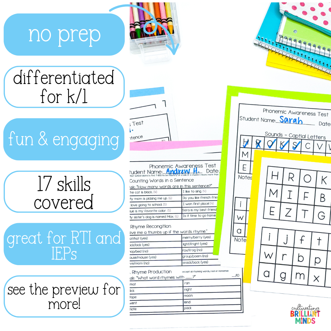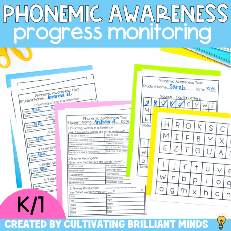 Get your students increasing their phonemic awareness skills with this progress monitoring pack that’s perfect for RTI, IEPs, and small group. This phonemic intervention pack contains 17 phonemic awareness skills and capital and lowercase letter and sound recognition.
