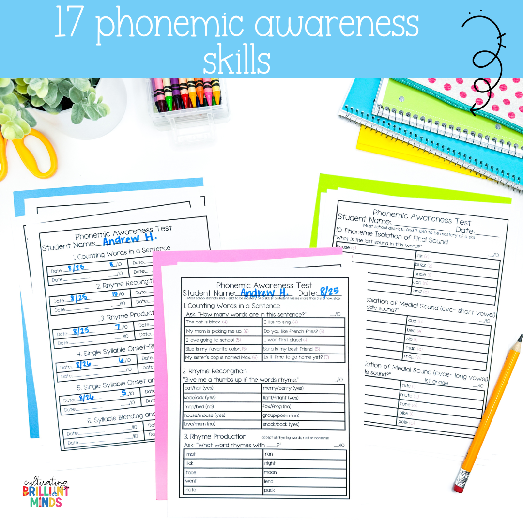 Each of the 17 skills has 10 items. Most school districts believe 7 or 8 out of 10 to be mastery of the skill. These 17 phonemic awareness skills were pulled from Common Core Standards and are best used with K-1, but can be used with Pre-K and second graders who still need progress monitoring with these skills. If a student misses 3 in a row, stop and use intervention strategies to teach the skill, then come back in about a week and retest.