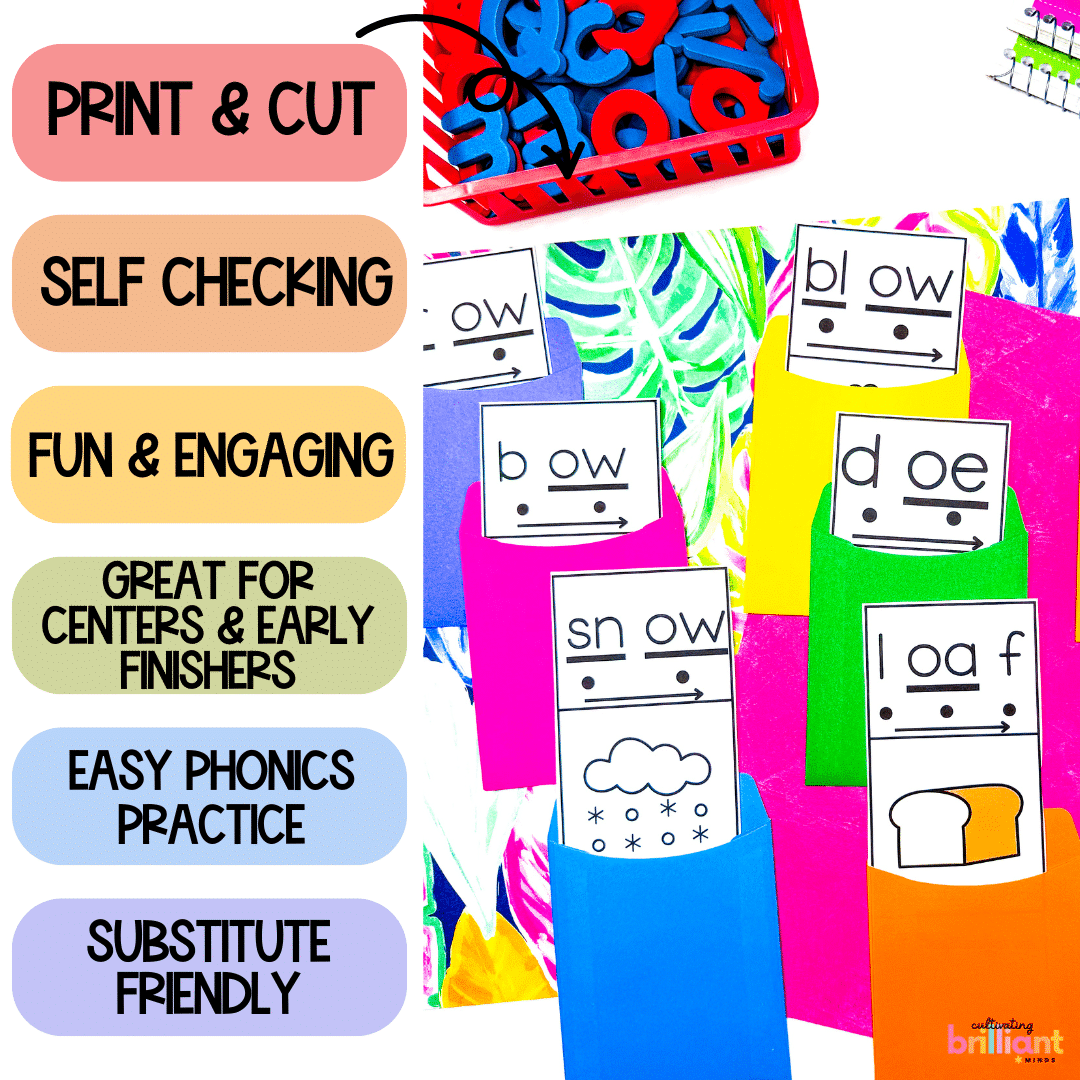 Get your students reading Long O Words (OA, OW, and OE) like pros with these fun and engaging self checking mystery word phonics centers! Featuring 22 long o words, your students will be decoding and reading oa, ow and oe words in no time!