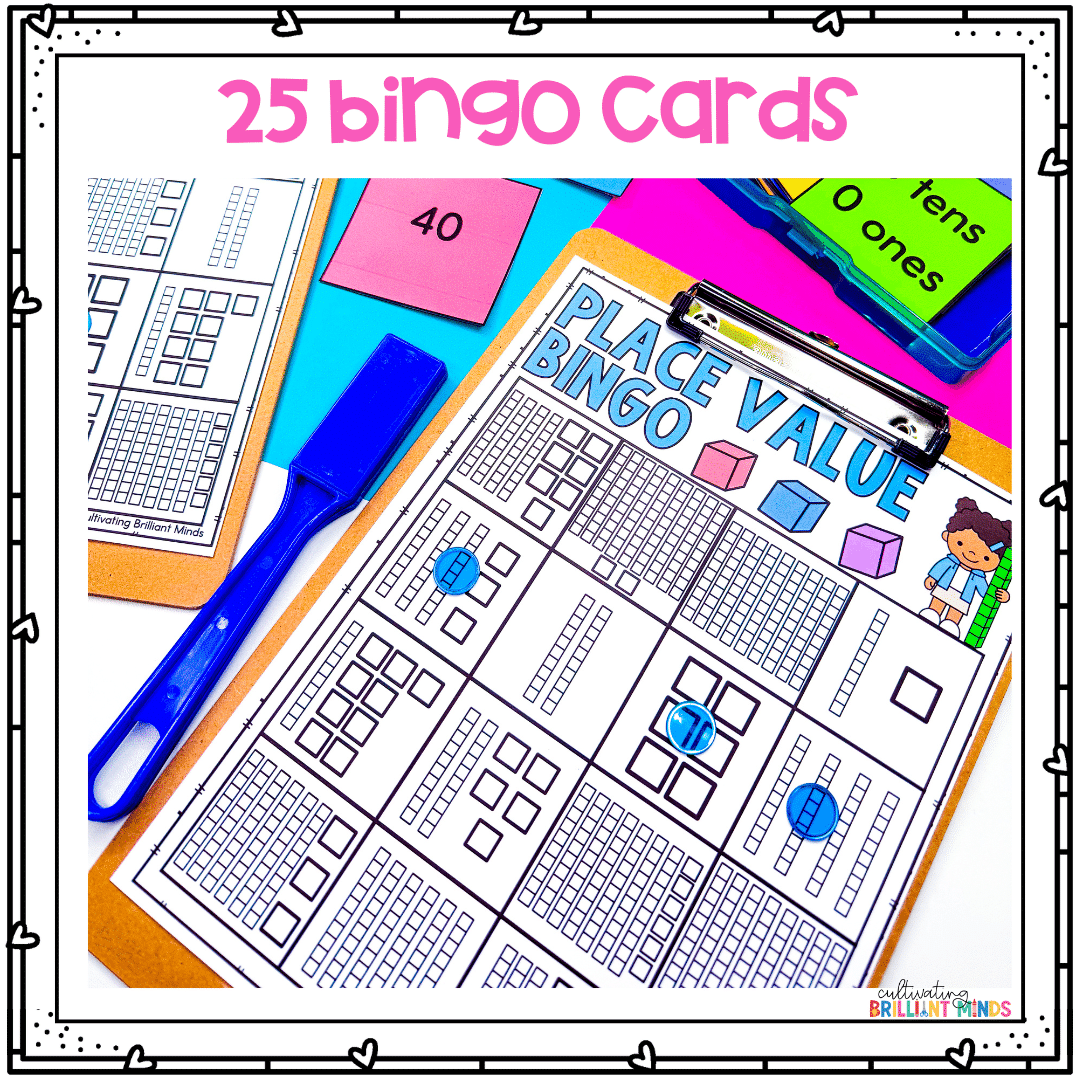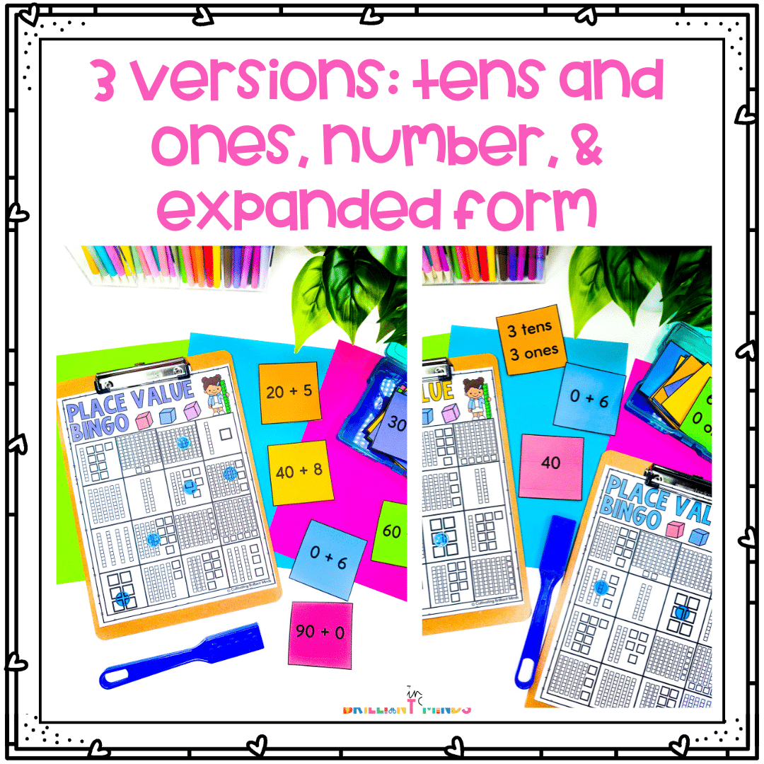 - 3 versions of calling cards (tens and ones, number, and expanded form)