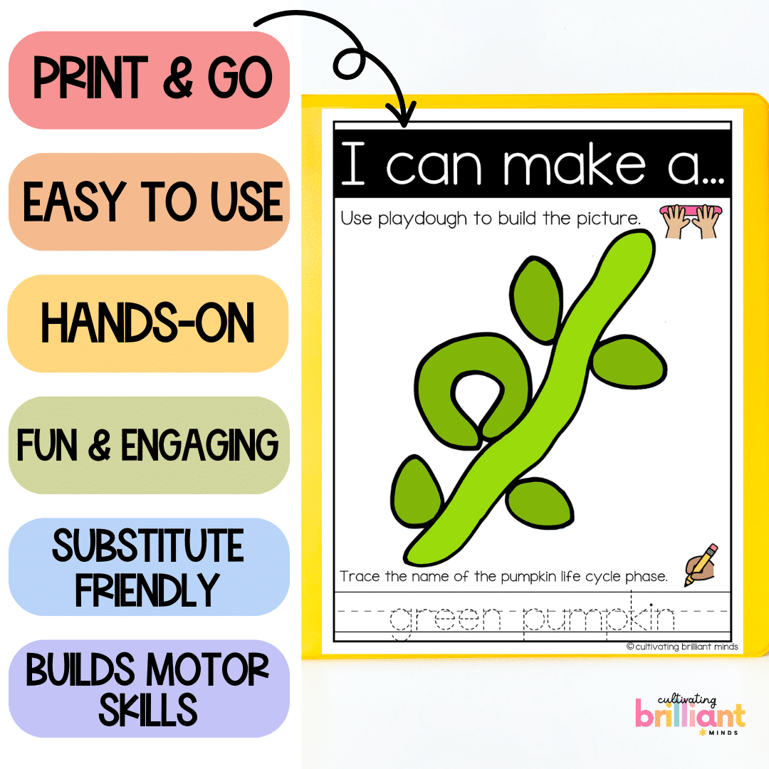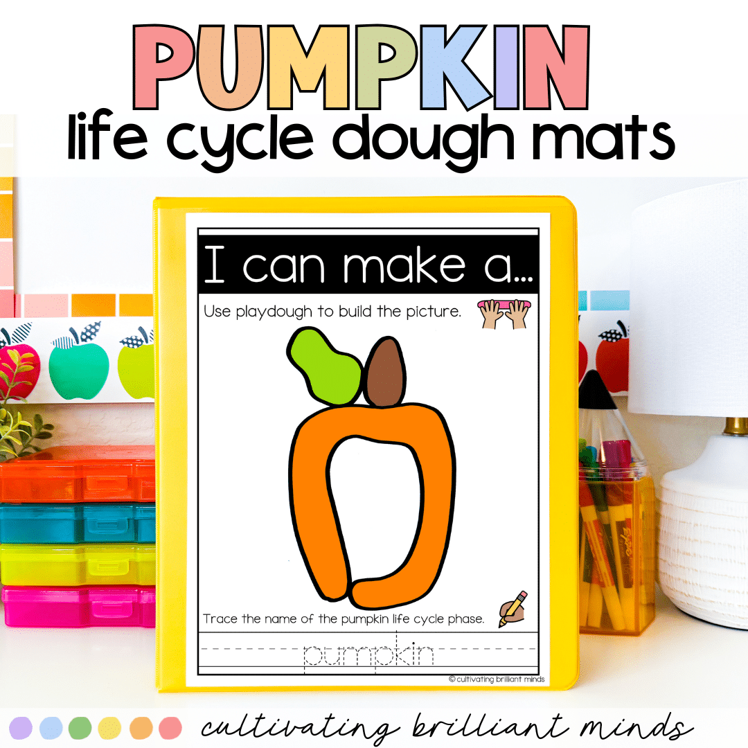 Get your students building their fine motor skills with these fun hands-on Pumpkin Life Cycle Playdough Mats! This low-prep center is easy to implement and focuses on color recognition and writing. These play dough activities are perfect for targeting motor skills & make great centers or morning tubs. These are great to pair with your science pumpkin unit or pumpkin-themed day to learn all about the pumpkin life cycle!