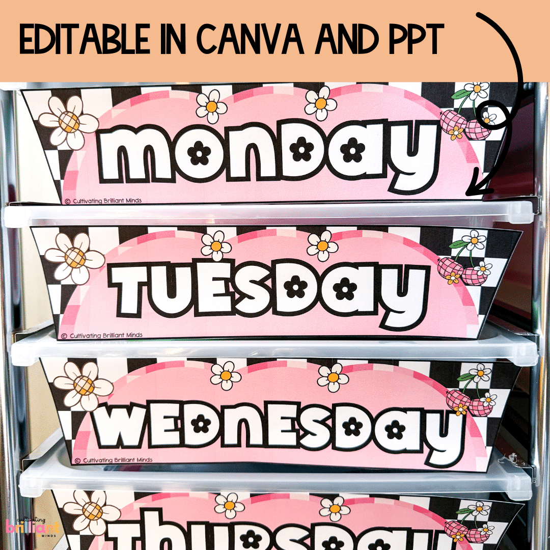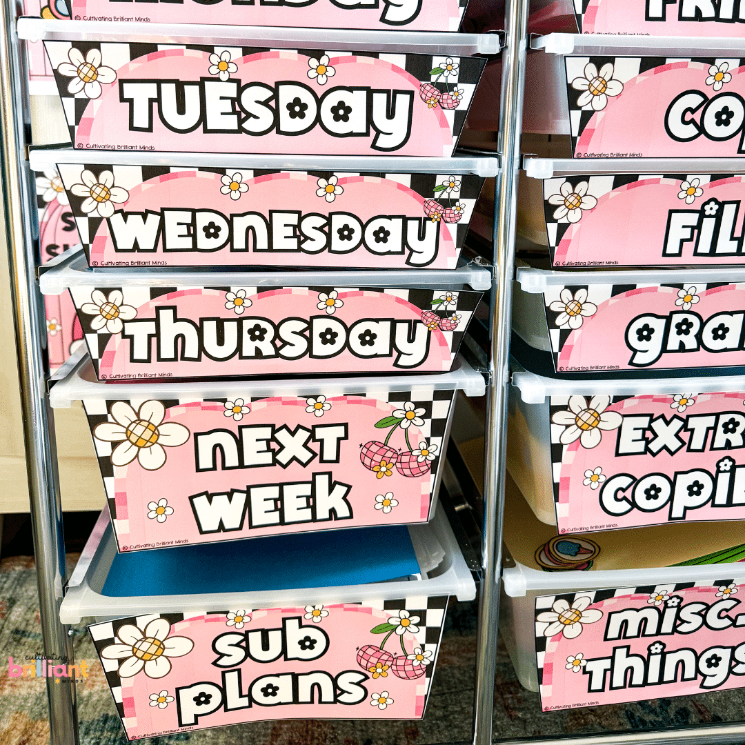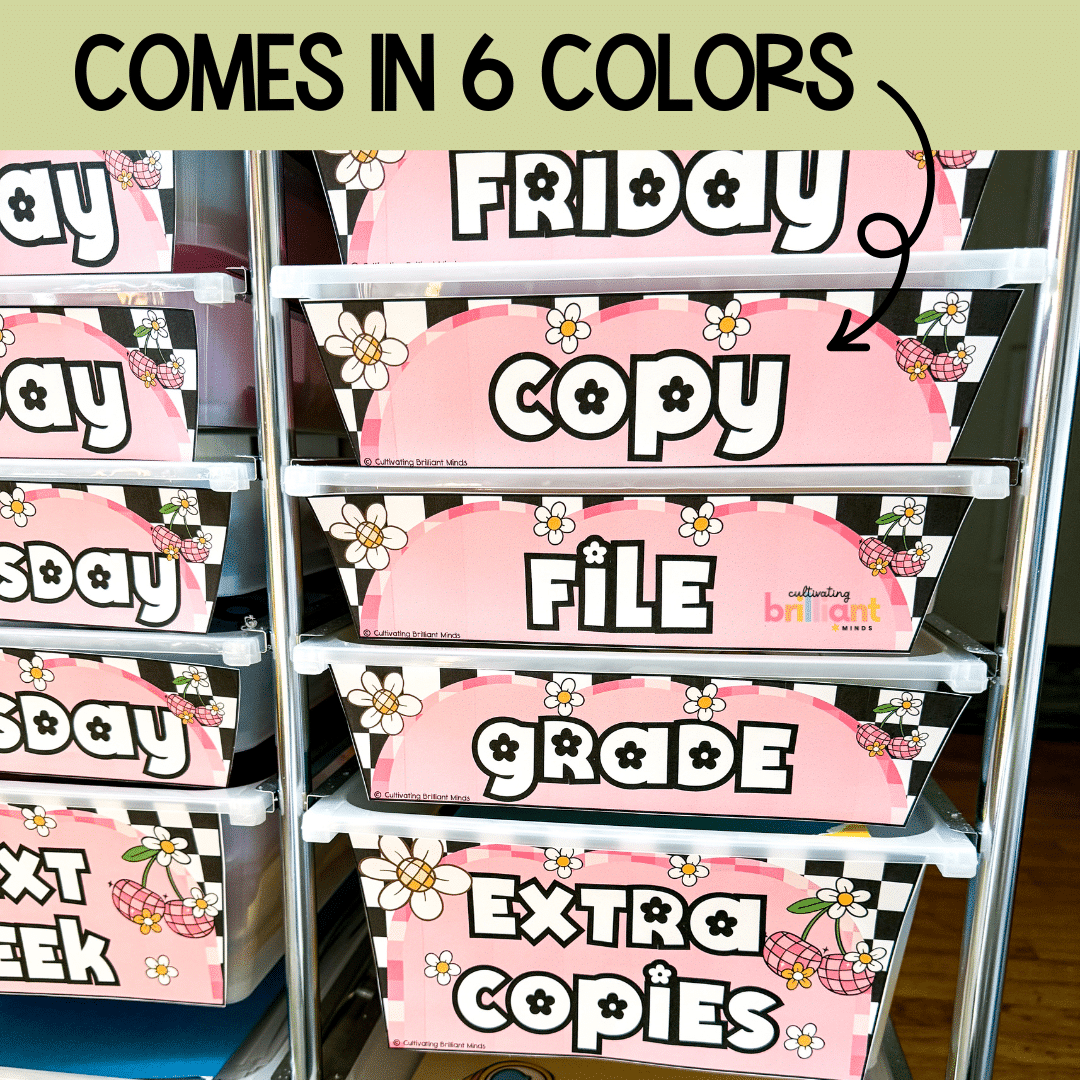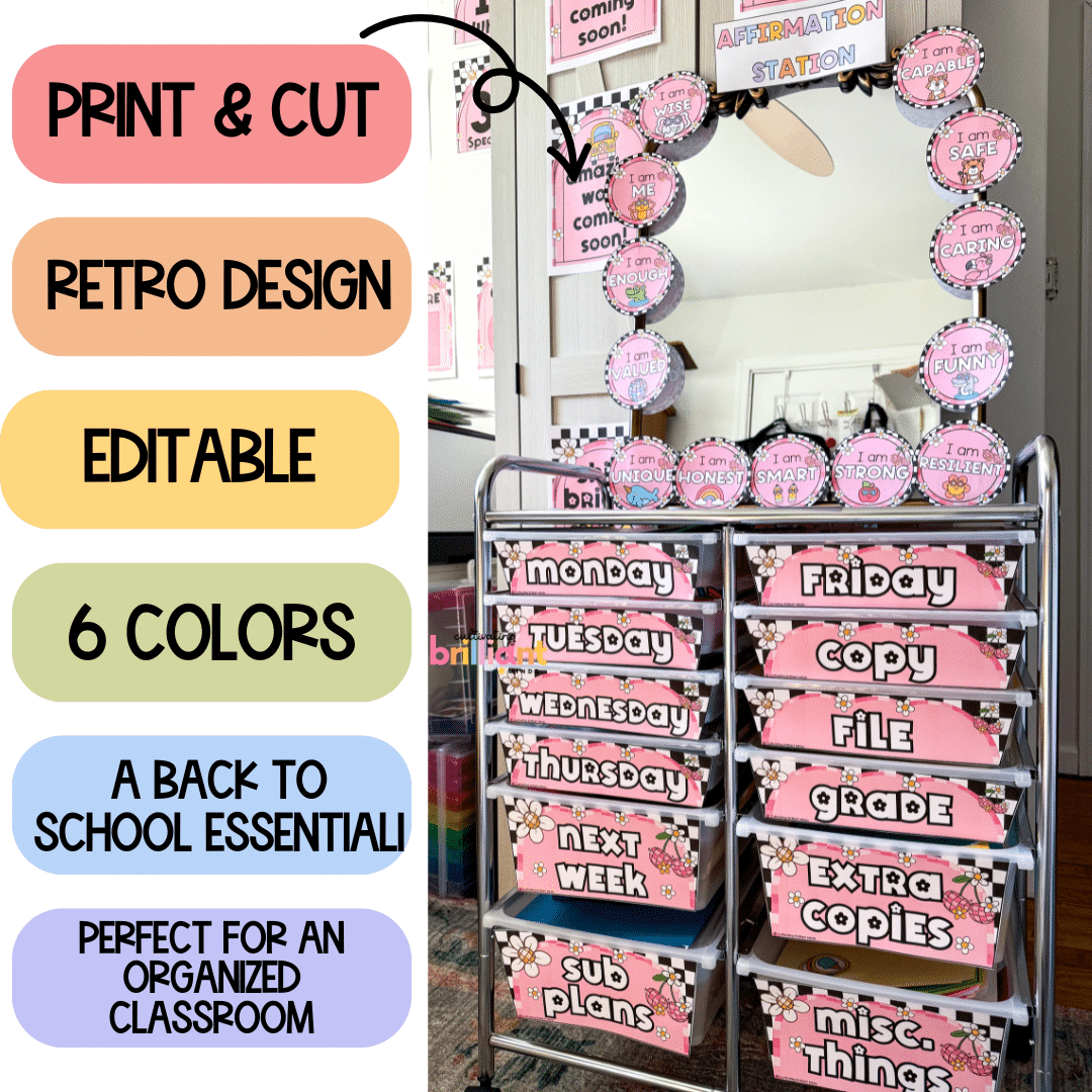 Stay organized this back to school season with these cute retro rolling cart drawer labels. With 6 different colors, you can mix and match these cart labels.
