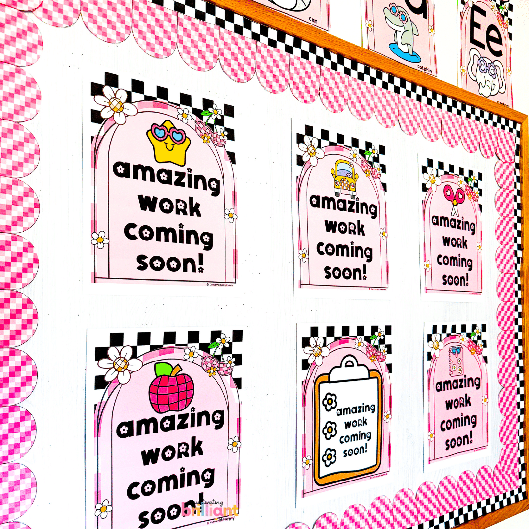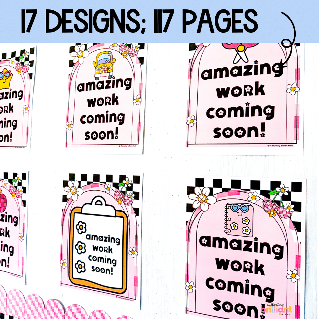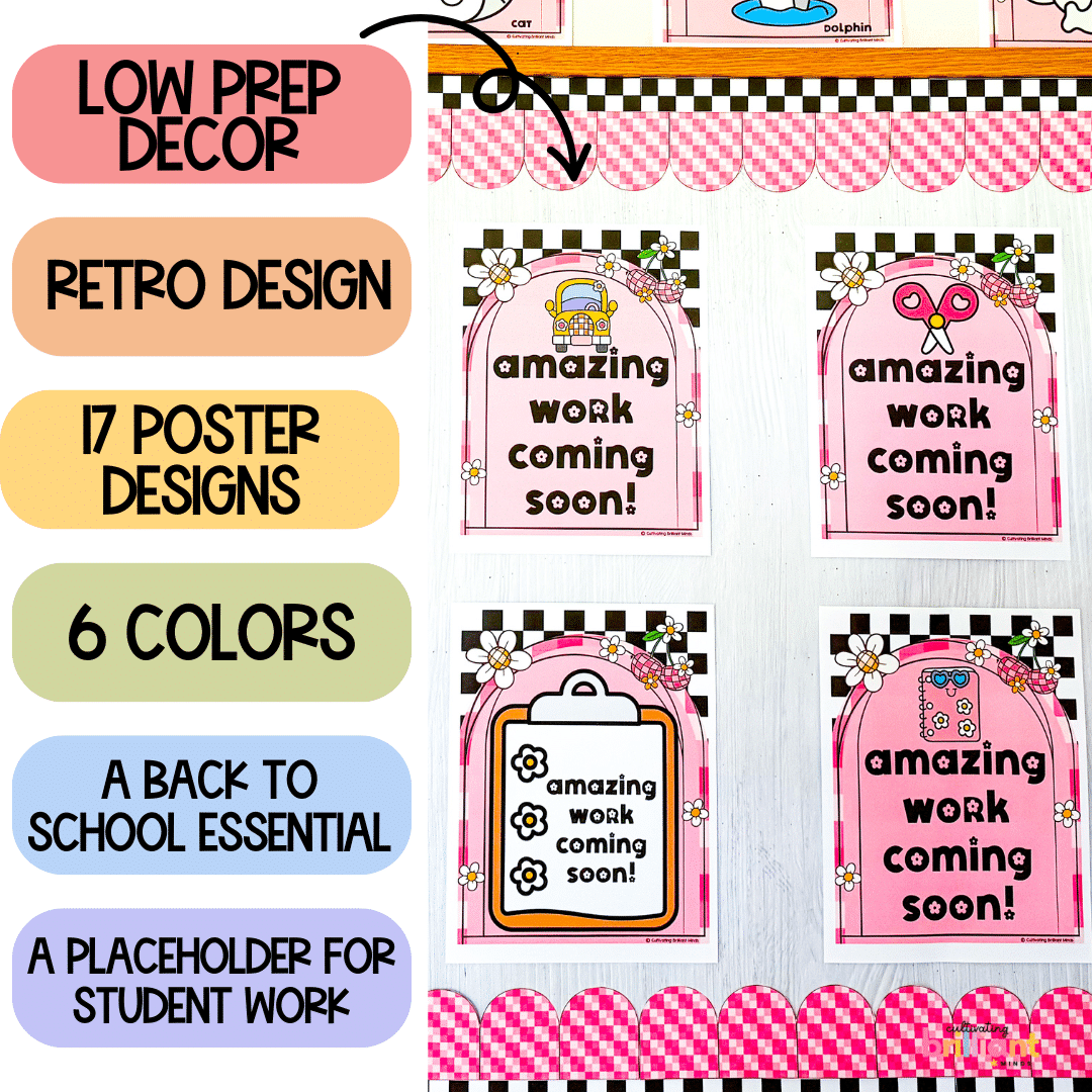 Are you looking for cute classroom decor placeholders for your students’ work? These Retro Amazing Work Coming Soon posters are the perfect placeholders for your classroom. The retro design is cute and welcoming and will look great in your classroom!