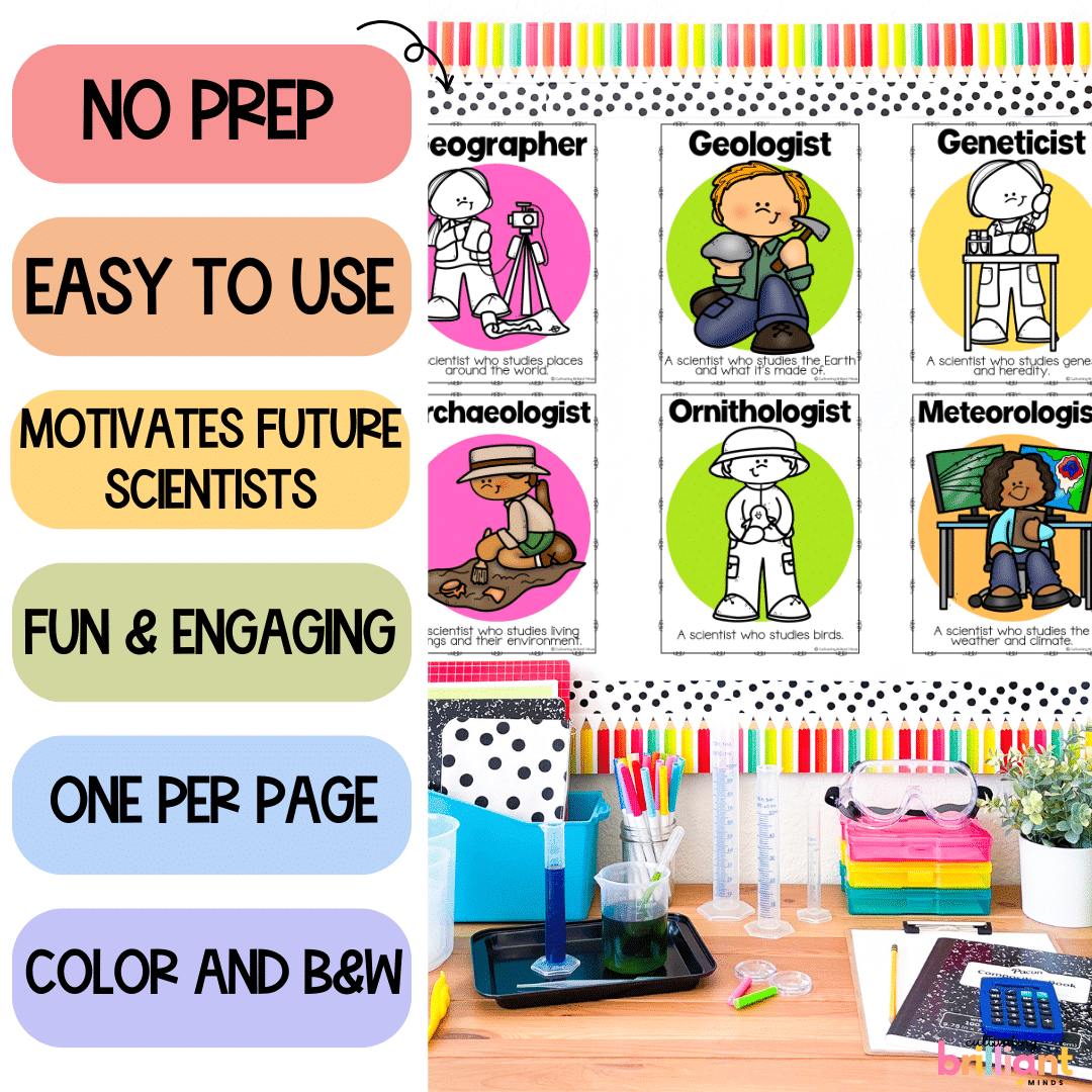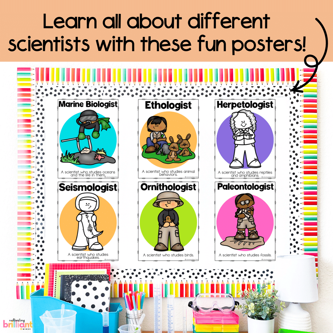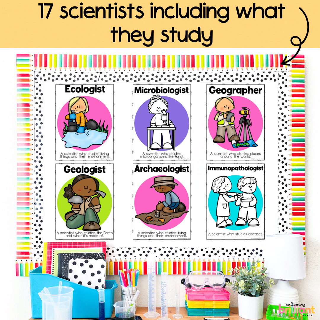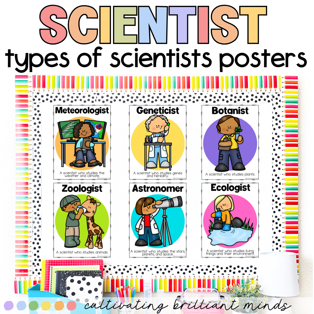 Teach your students all about the different types of scientists with these fun and colorful science posters that make a great science bulletin board display! Students will learn about the kinds of scientists and reference the posters throughout the school year. They are also a great motivational tool for your future scientists!