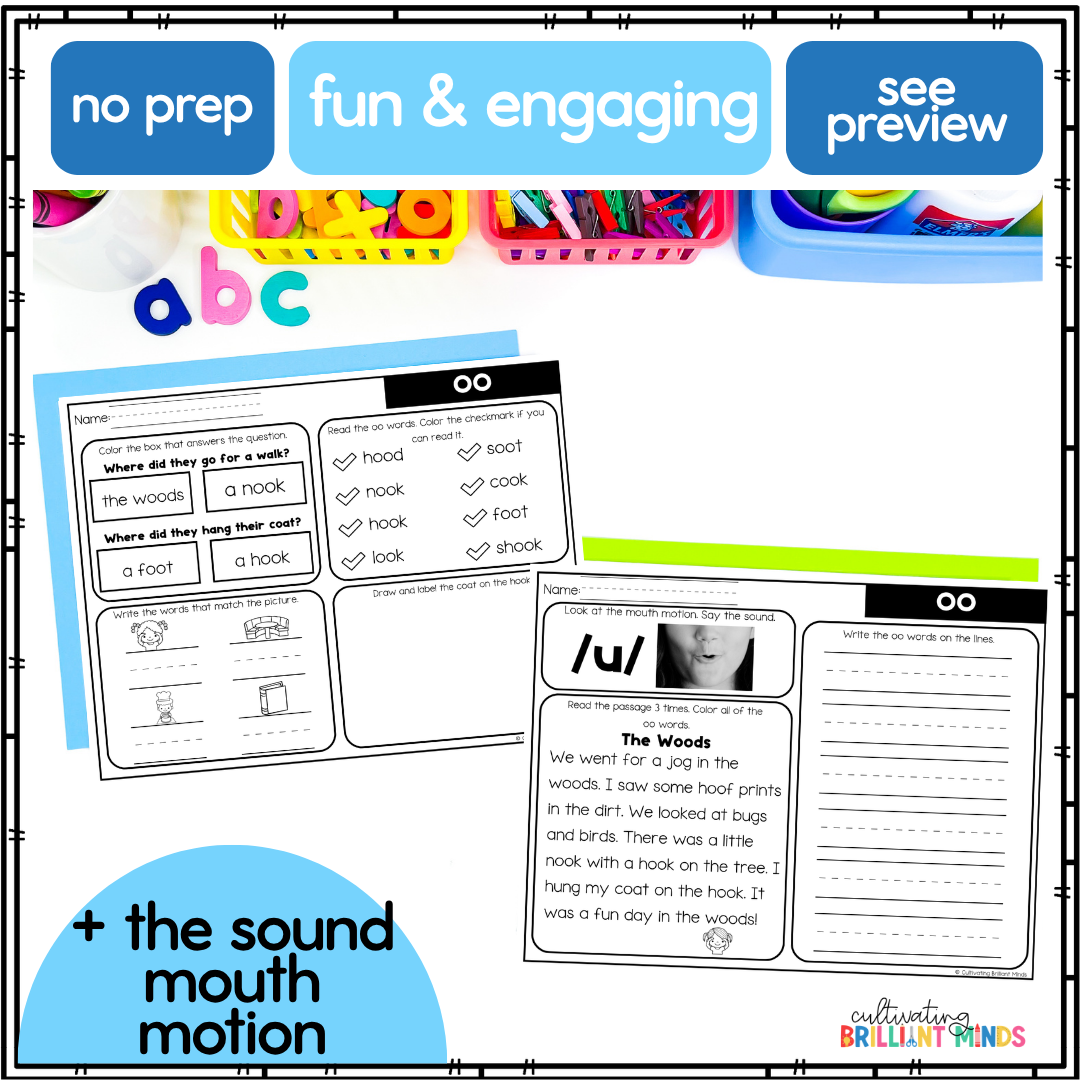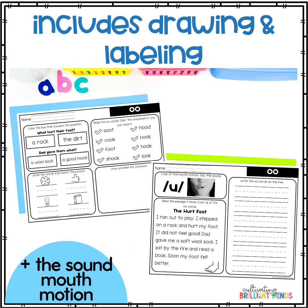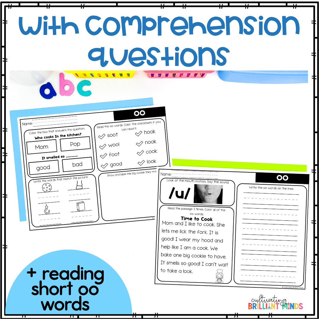 Are you looking for decodable passages with comprehension questions and word work for Short U OO words? These Short OO Decodable Passages are perfect for First Grade and Second Grade. Utilizing decodable words and common sight words, these decodable passages allow students to focus on the sound. These include a real-life picture of the mouth movement to say the sound.