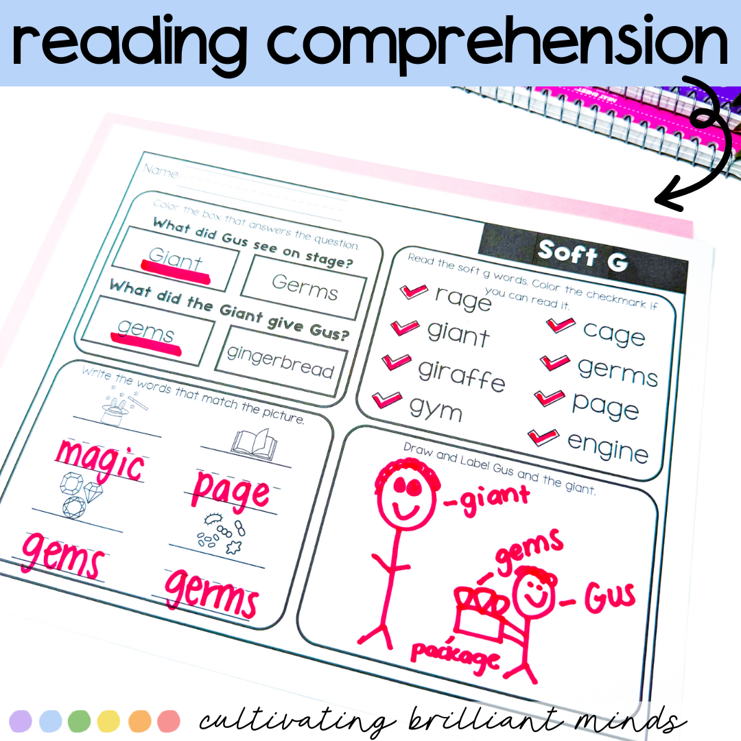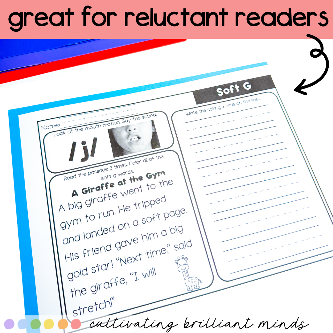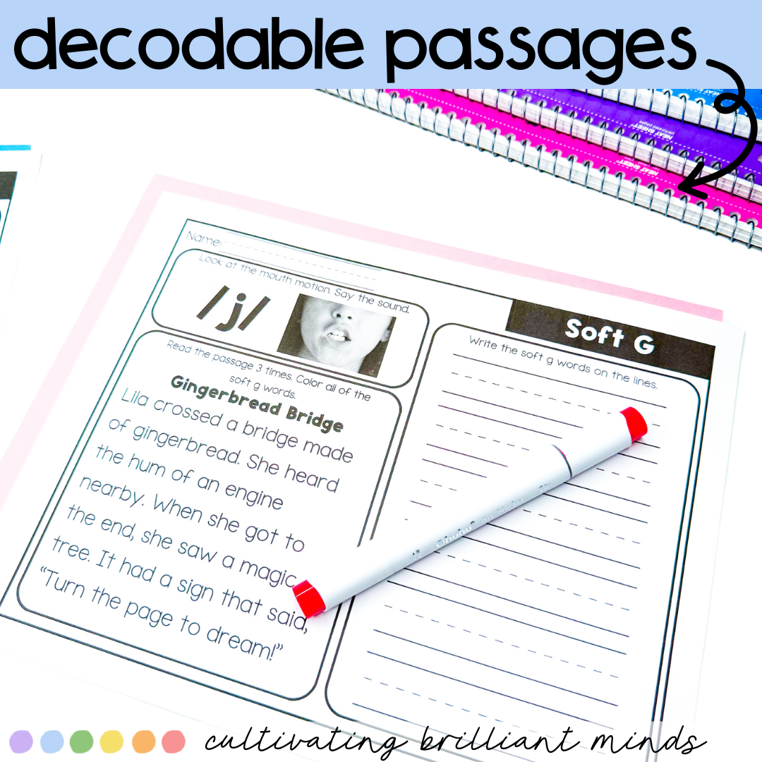 Are you looking for decodable passages with comprehension questions and word work for Soft G words? These Soft G Decodable Passages are perfect for First Grade and Second Grade. Utilizing decodable words and common sight words, these decodable passages allow students to focus on the sound. These include a real-life picture of the mouth movement to say the sound.