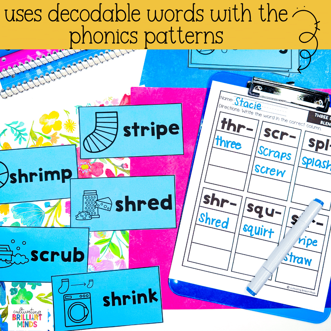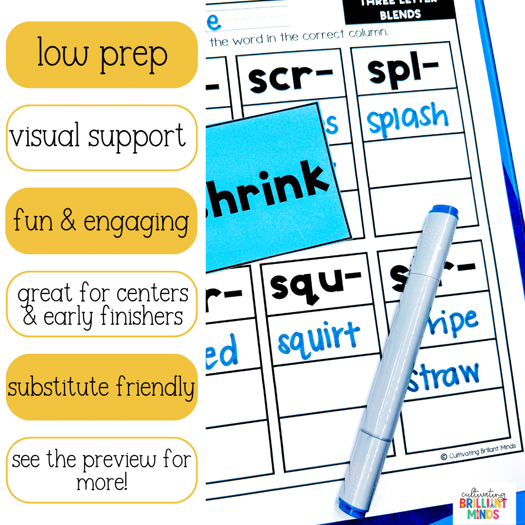 Get your students practicing the three letter blends phonics patterns like pros with these fun phonics word sorts for the entire year. These phonics activities are the perfect literacy center that your students can complete independently.