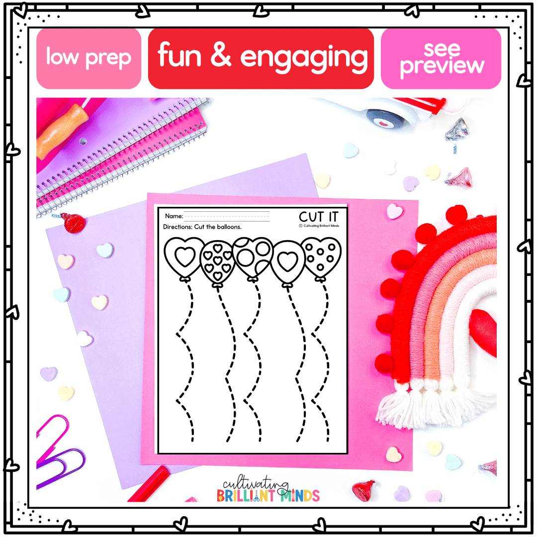 - 25 pages of valentines cutting practice with multiple types of lines (zigzag, wavy, curved, etc.)