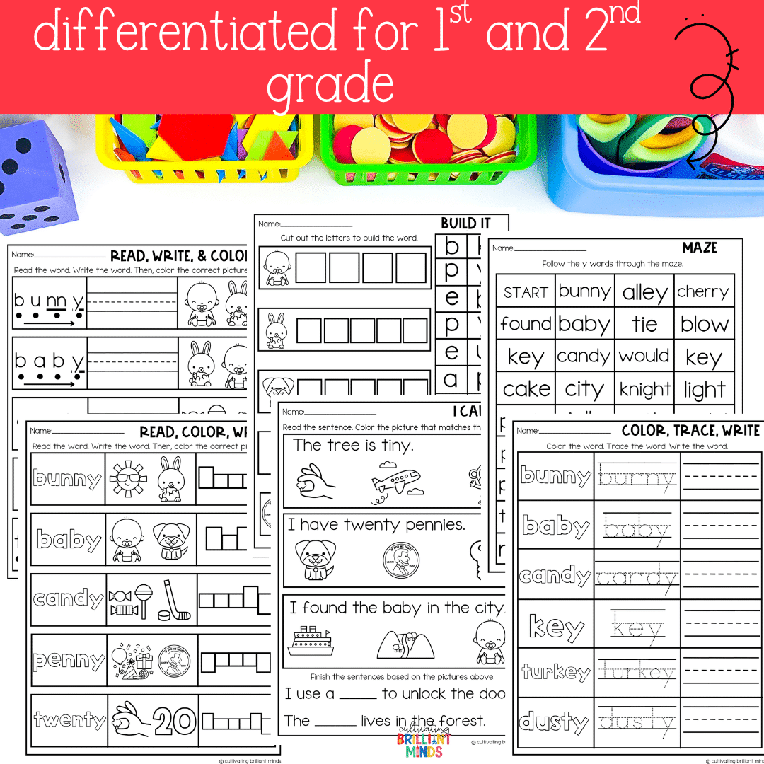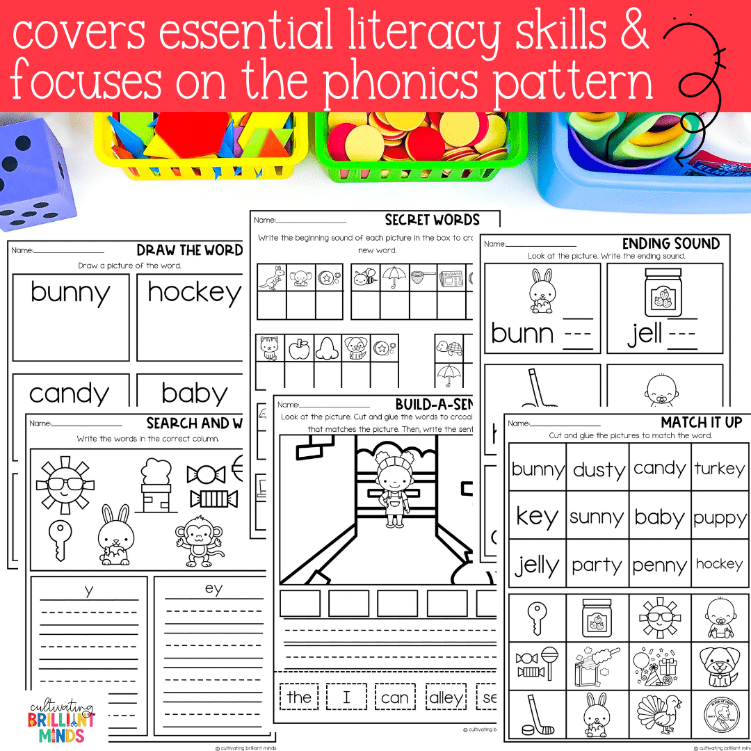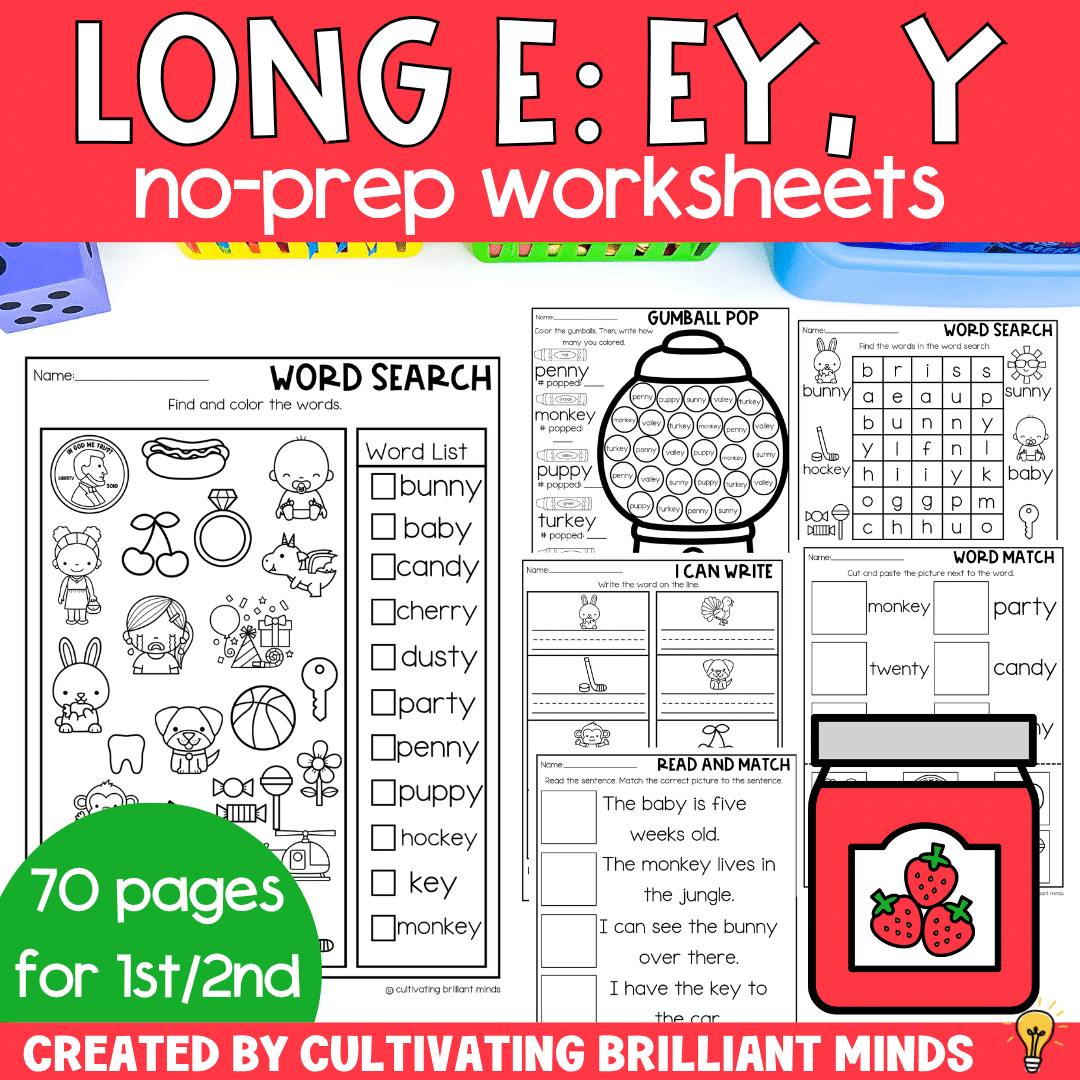 Keywords: Kindergarten | First Grade | Second Grade | Vowel Teams | Long E: EY, Y | No Prep Literacy Worksheets | No Prep Phonics Worksheets