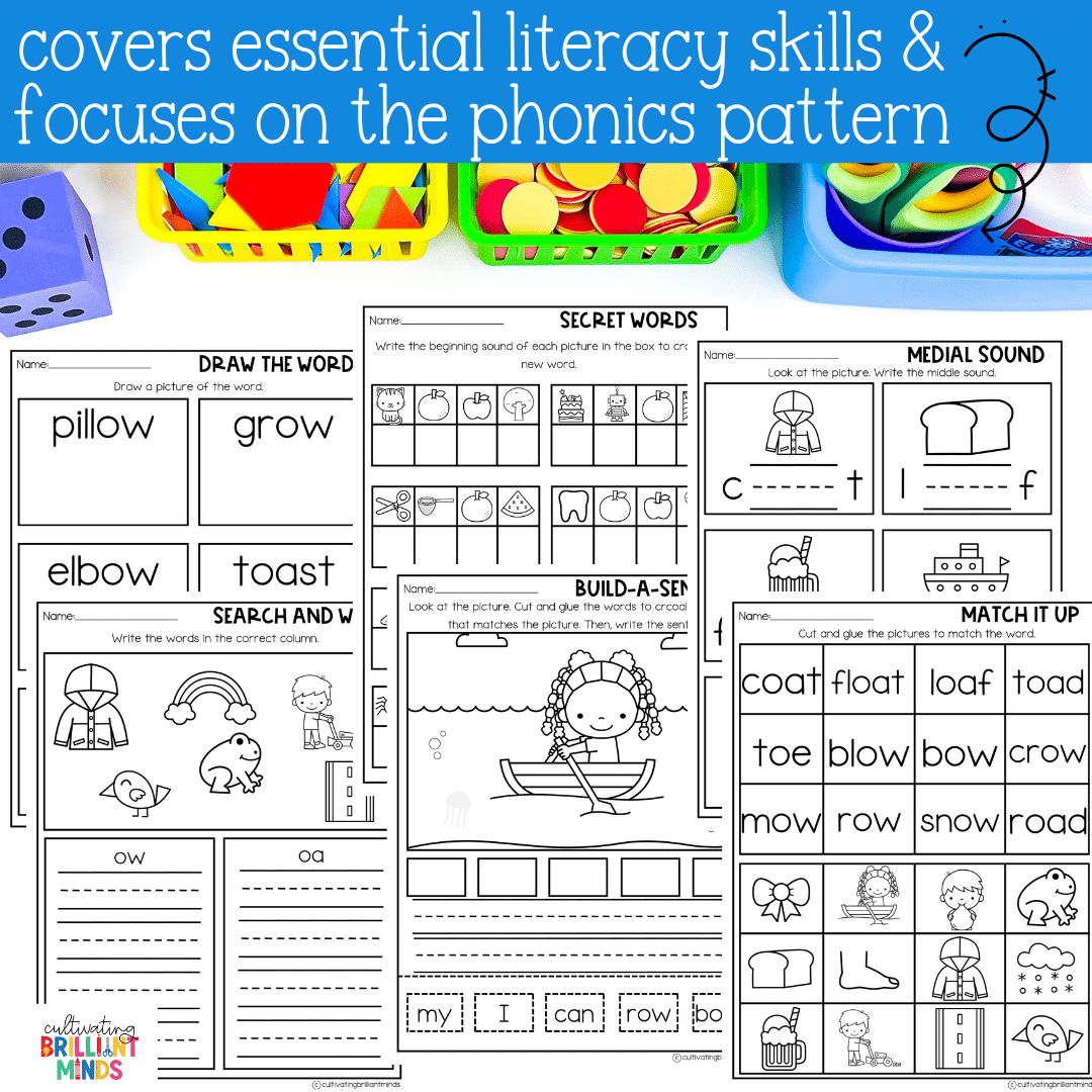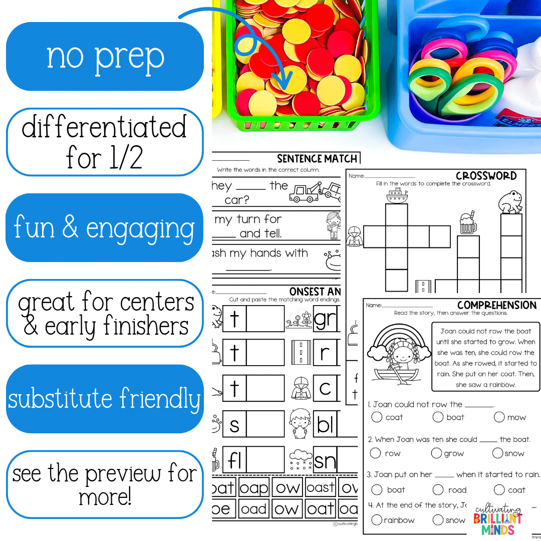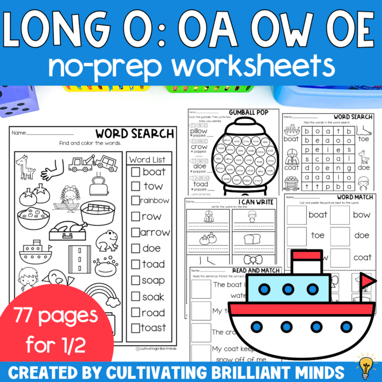 Keywords: Kindergarten | First Grade | Second Grade | Vowel Teams | Long O: OA OW OE | No Prep Literacy Worksheets | No Prep Phonics Worksheets