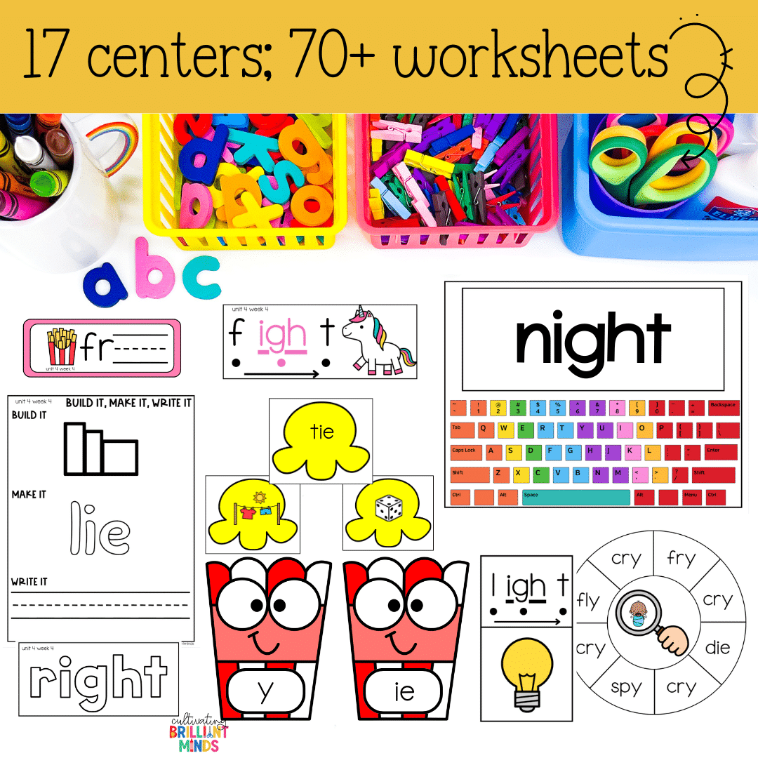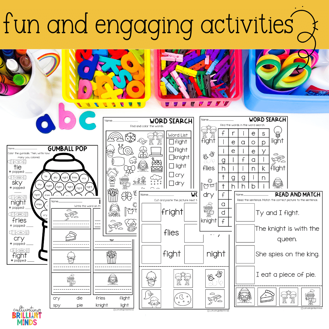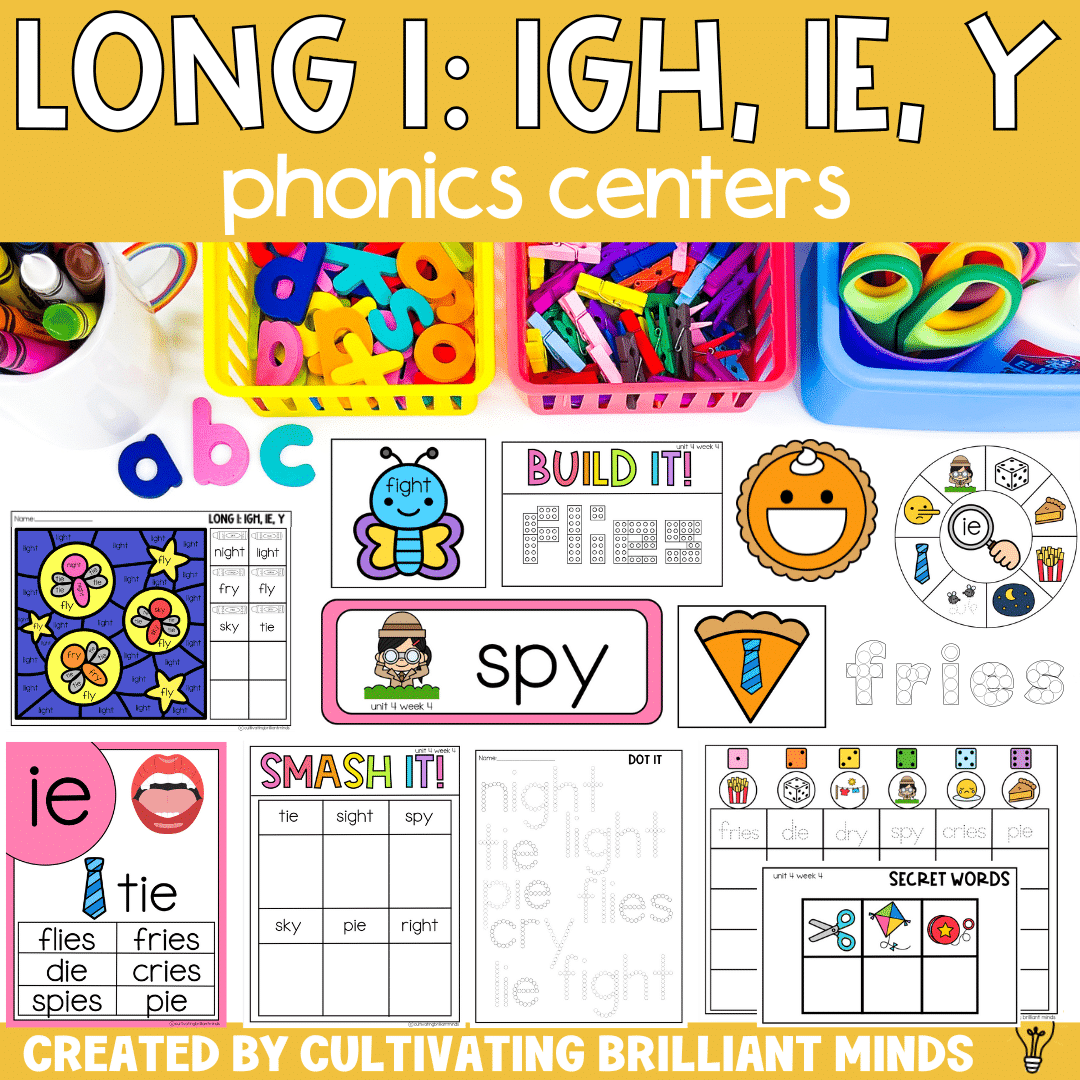 Vowel Teams Phonics Centers & Worksheets | Long I: IGH, IE, Y Phonics Activities