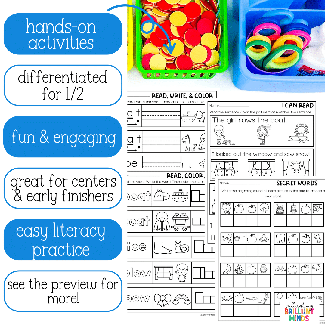 Are you guilty of having worksheets for every center? (don’t worry – I was, too!). This is why I created these hands-on centers that focus on phonics patterns and motor skills. With a mixture of fun worksheets and hands-on activities, your students will learn their phonics patterns while staying engaged (which also decreases behavioral problems – WIN-WIN!!)