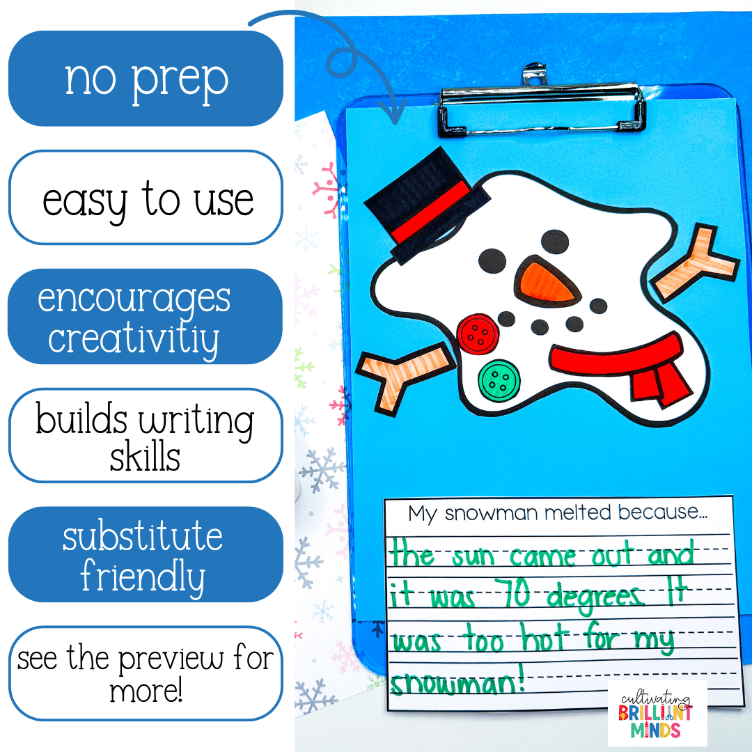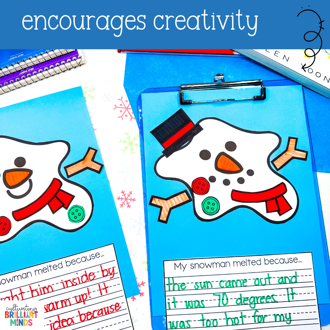 Students will have so much fun creating their melted snowman and writing about why he melted! They all turn out so unique and they come up with creative reasons why the snowman melted.
