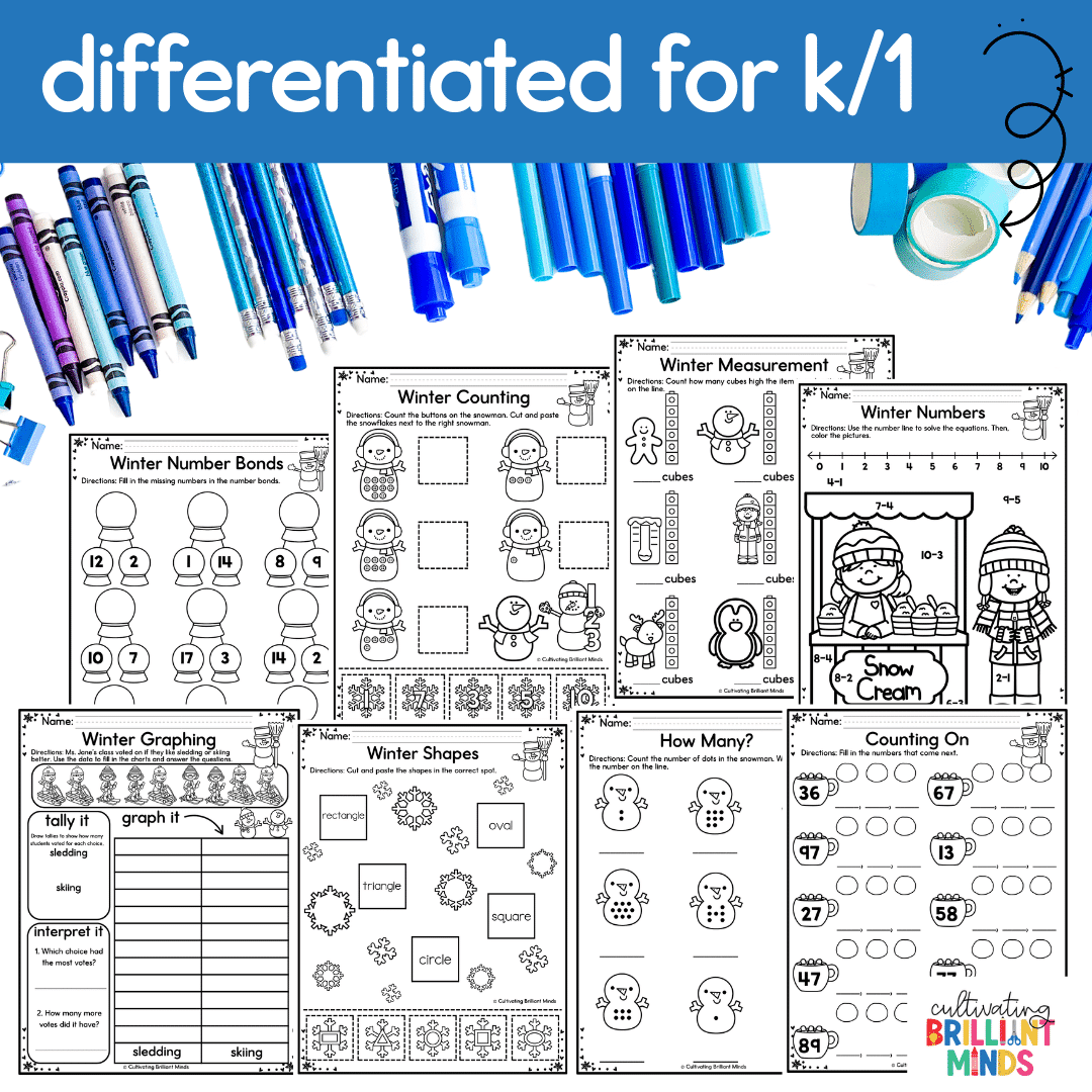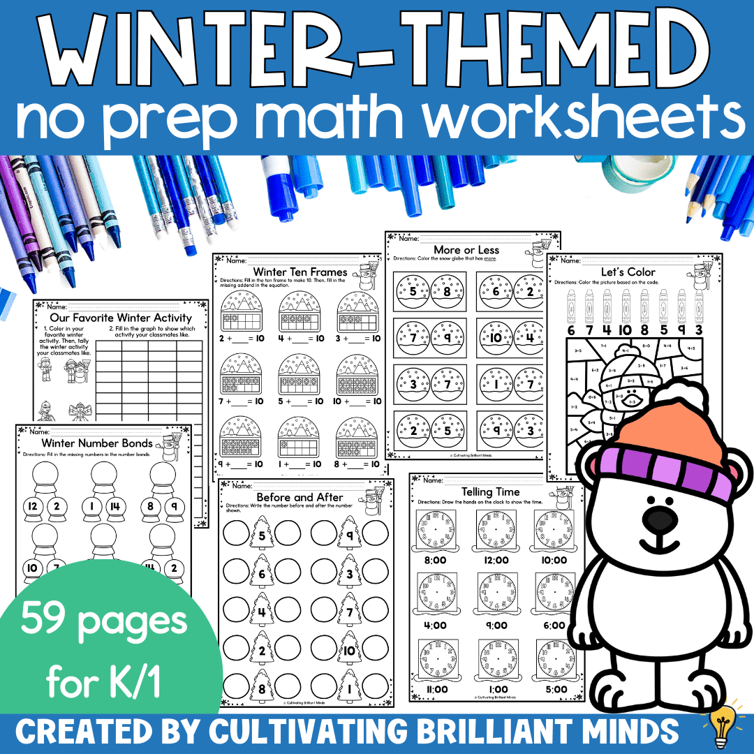 Let’s get your students practicing essential kindergarten / first grade math skills with these no prep winter math worksheets! These winter-themed math worksheets include various versions for easy differentiation, whether you teach kindergarten or 1st grade!