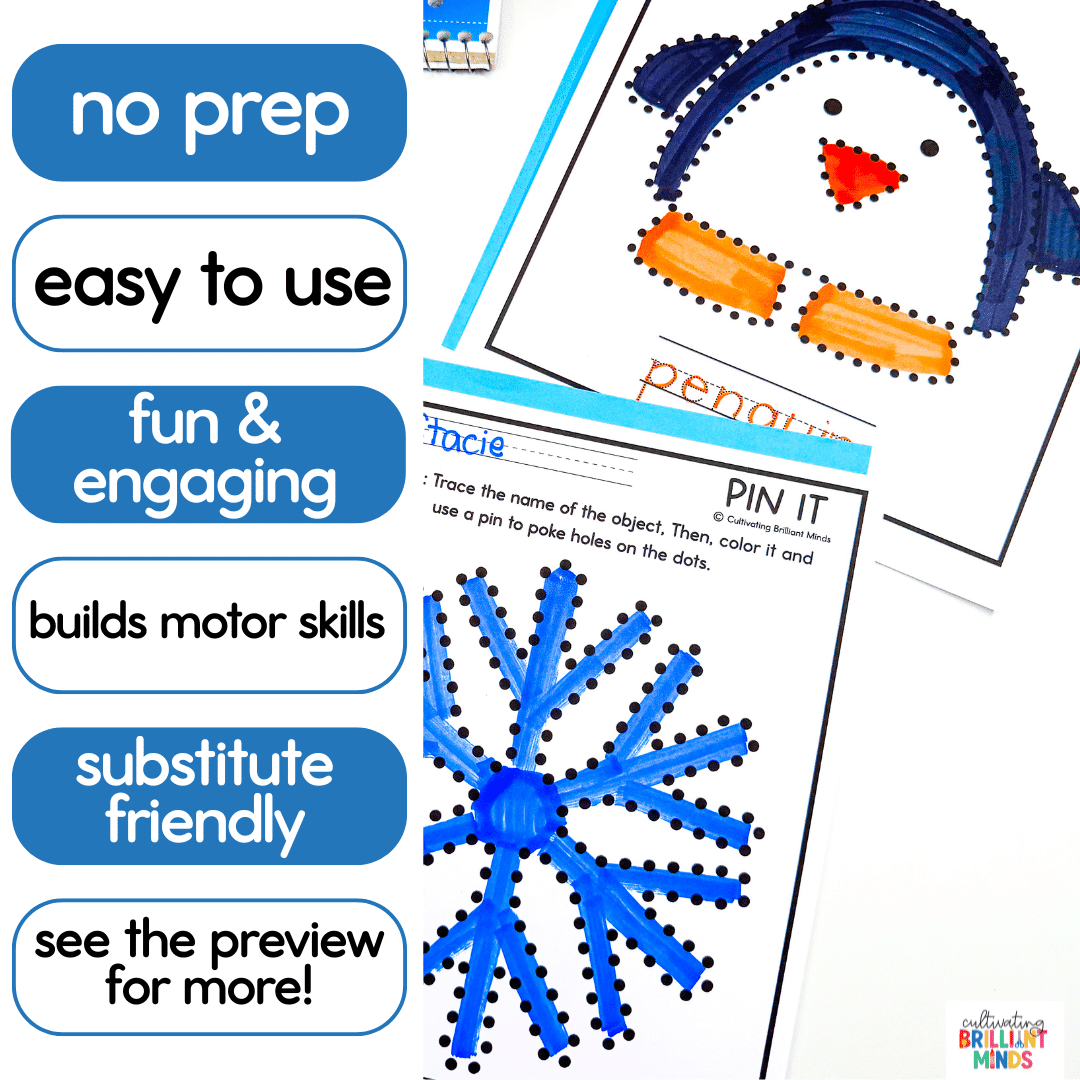 Get your students building motor skills like pros this winter with these fun winter-themed fine motor pin poking activities! Your students will love making these winter-themed items by coloring the image and poking the circles with a pin with these hands-on and engaging cards that will help build the muscles in their hands and fingers. Use these fun motor activities for morning work, morning tubs, centers, or sub plans!
