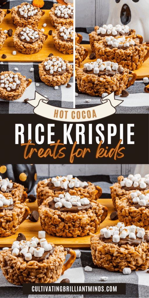Pair these hot cocoa rice krispie treats with a book and a warm mug of hot chocolate. Read a seasonal story together and then enjoy these rice krispie “mugs” as a snack.
