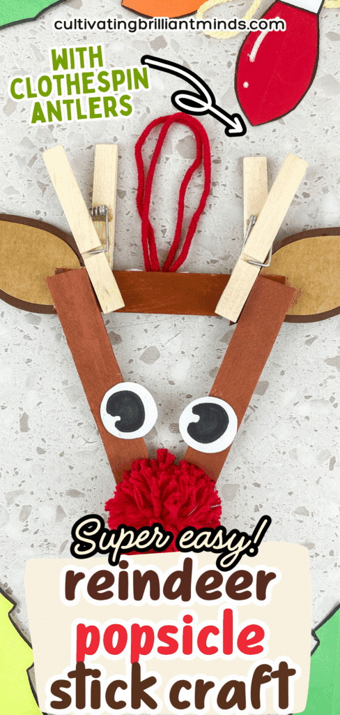 To make a Reindeer Popsicle Stick Ornament, you’ll need three popsicle sticks, brown paint, a paintbrush, scissors, construction paper, glue, a clothespin, red yarn, a marker, and googly eyes. Grab my free template for the ears – it makes assembly even easier. These are all affordable, low-mess materials that work beautifully for both individual and group crafts.