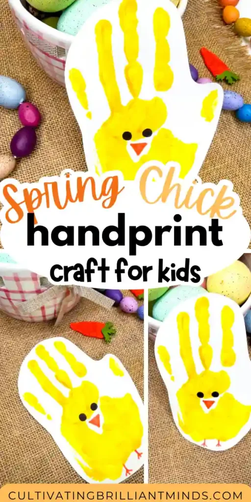 This chick handprint craft is an easy spring craft for kids that uses simple materials you already own to create a beautiful spring keepsake craft. Save this handprint craft in a memory book, or tie it with ribbon to create a spring garland. This easy craft for kids is perfect for spring crafts, Easter activities, and rainy days.
