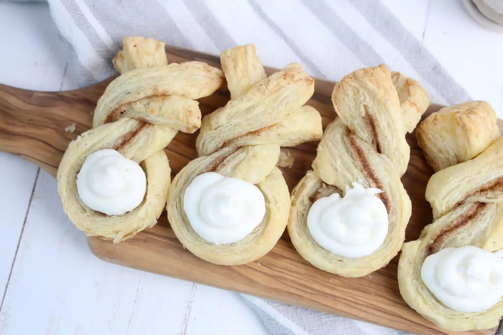 cinnamon and sugar pastries that are twisted to look like a bunny with icing as a cotton tail