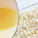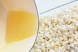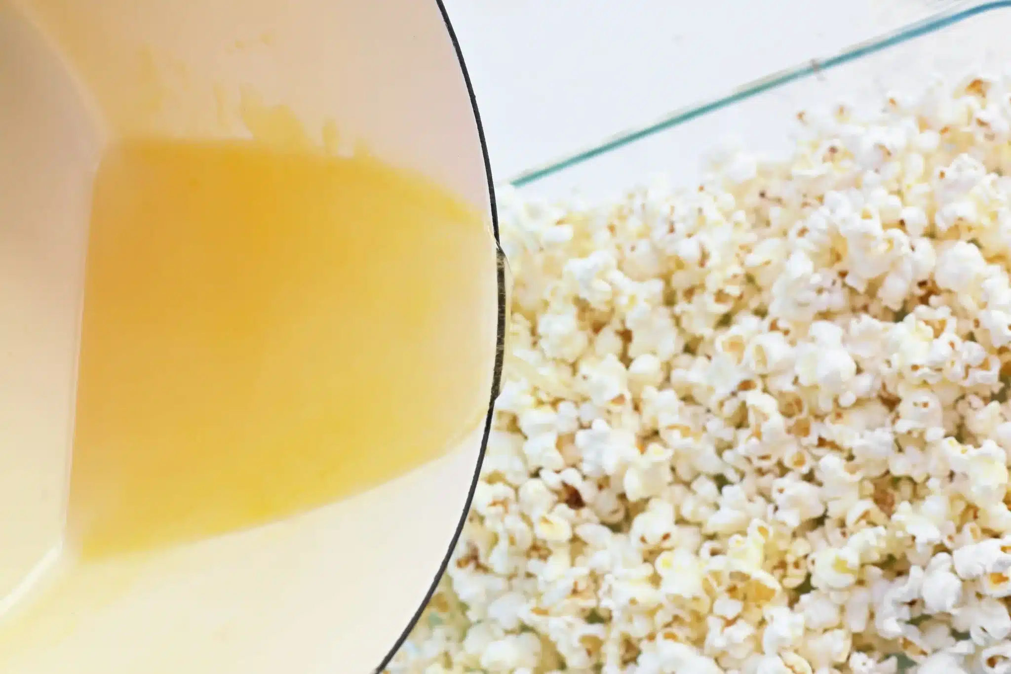a pan dumping the sugar, water, corn syrup mixture over the popcorn